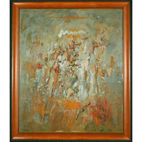 This is an expertly rendered abstract oil on canvas painting. The tones and colors of this painting are a great example of the level of mastery that Bageris has over his paint. The brushwork is very unique and gives the impression of motion. This painting is a perfect balance of quick, dashing and jagged strokes, combined with slow, smooth and curving strokes that feather out into nothingness. It is beautifully framed in a light stained wood that is trimmed with a decorative black, ornate border. The color of the wood is a perfect accent to the hues of orange in the painting, making ...