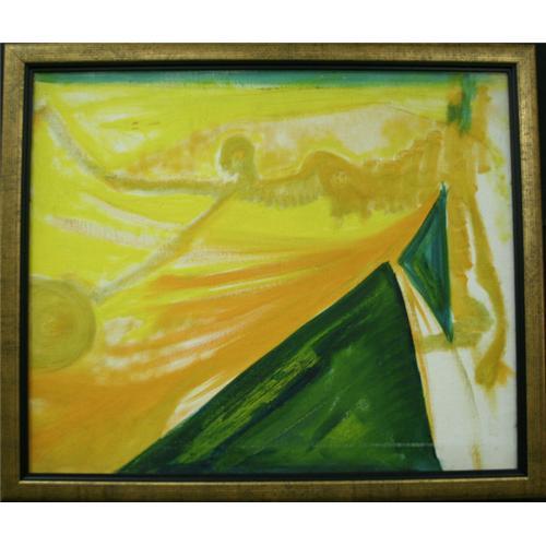 This beautiful oil on stretched canvas displays a brilliant mix of colors horizontally as they spread and flow into one another magically. The geometric influence is hinted at by the seemingly unconscious strokes of greens, yellows, and oranges of the piece, this painting is an original work measuring 26.5? x 22.5? total. The stunning flow of the paint draws the eye throughout the work, the long and sweeping brushstrokes lend movement to this abstract painting. One can almost make out abstracted figures within the painting. The simple gold with black wooden frame accentuates the color and originality in the piece and offers a sleek elegance to an otherwise colorful abstraction. The unique matting and framing presentation of this piece was individually selected and created by Le Chateau?s renowned master framer, Jeanette Shoenrock, and bears her signature on the back. This work is truly terrific for an abstract collection of any sort.