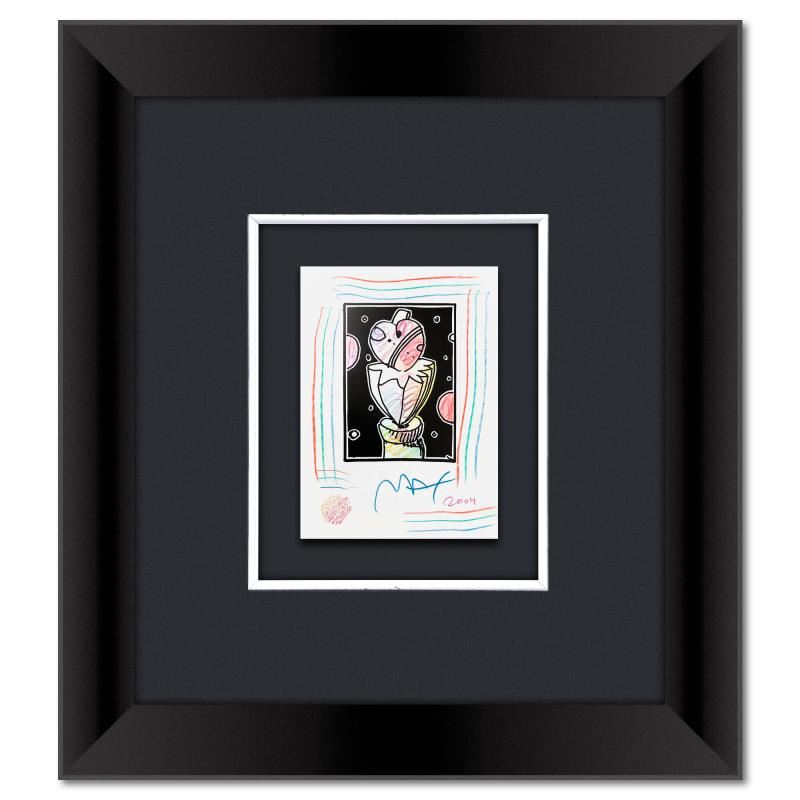 "Two Profiles" is a one-of-a-kind mixed media on paper, hand signed by Peter Max. The piece comes custom framed with a backside cutout to display Peter Max Studio registration number 340397 certifying authenticity. Measures approx. 22.5" x 21.5" (frame), 8" x 6" (image).