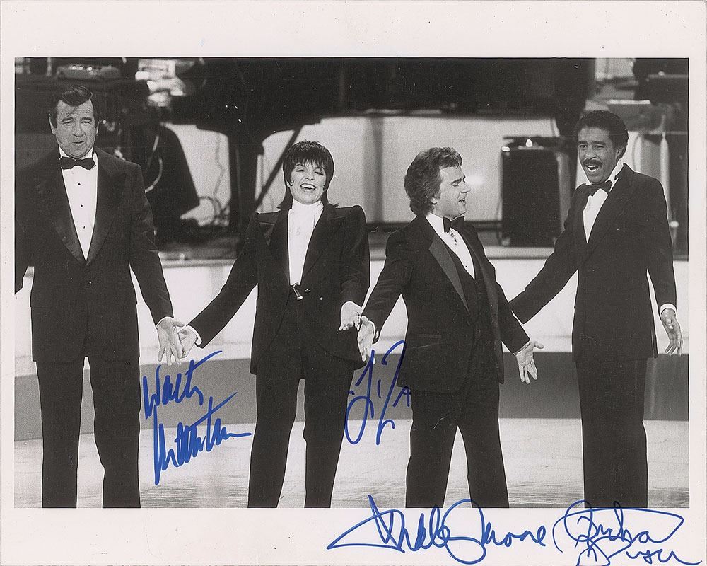 Fantastic glossy 10 x 8 photo of the four presenters of the 55th Academy Awards, signed in blue felt tip by Liza Minnelli, Dudley Moore, Richard Pryor, and Walter Matthau. Reverse bears an AMPAS/Long photography stamp. In fine condition. From the Harvey and Rhoda Kuflik Collection.