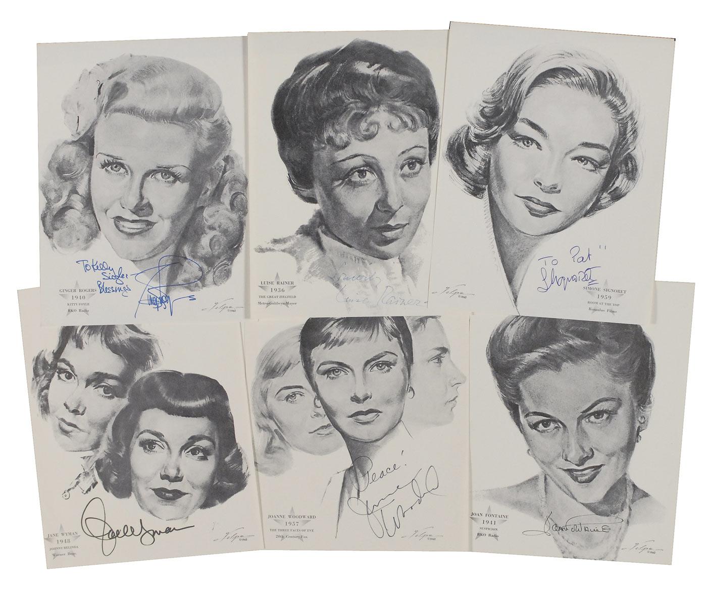 Six Volpe prints, 8 x 10.25, each signed in felt tip or ink by the respective Academy Award winner pictured. Signers are: Ginger Rogers (ins), Luise Rainer, Simone Signoret (ins), Joan Fontaine, Joanne Woodward, and Jane Wyman. In fine condition, with some mild haloing to Wyman’s signature.