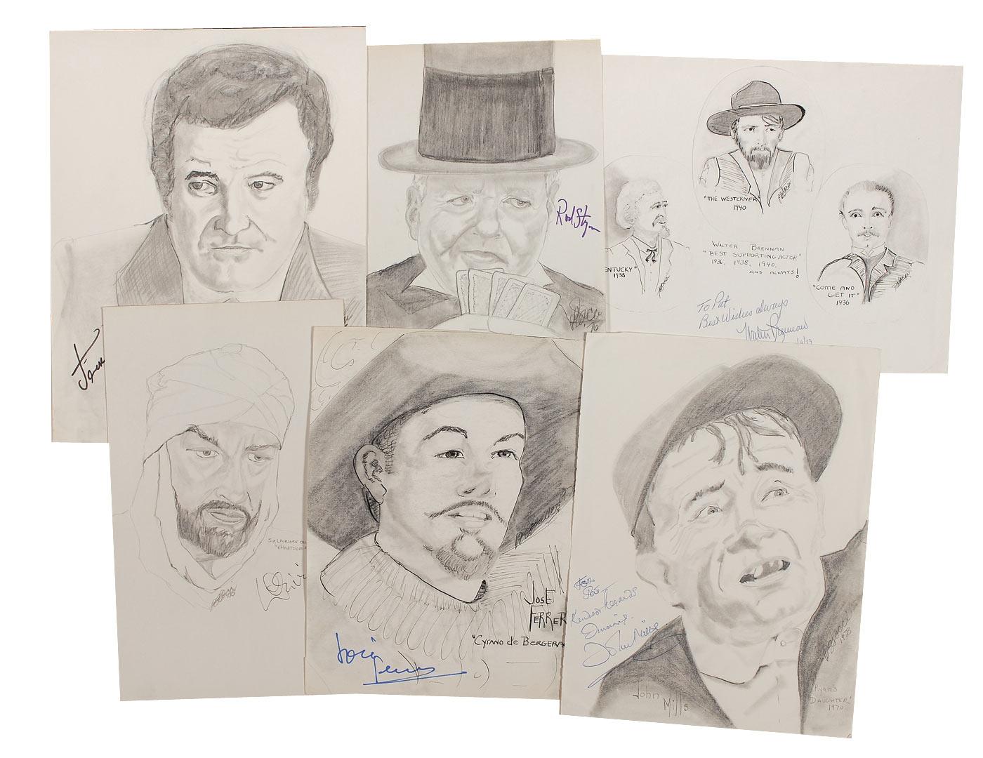 Six original pencil sketches, all done by an admirer, ranging in size from 8.25 x 11 up to 9 x 12, each signed in ink or felt tip by the respective actor pictured. Signers are: Walter Brennan (ins), Jack Lemmon, Rod Steiger, Jose Ferrer, Laurence Olivier, and John Mills (ins). In fine overall condition.