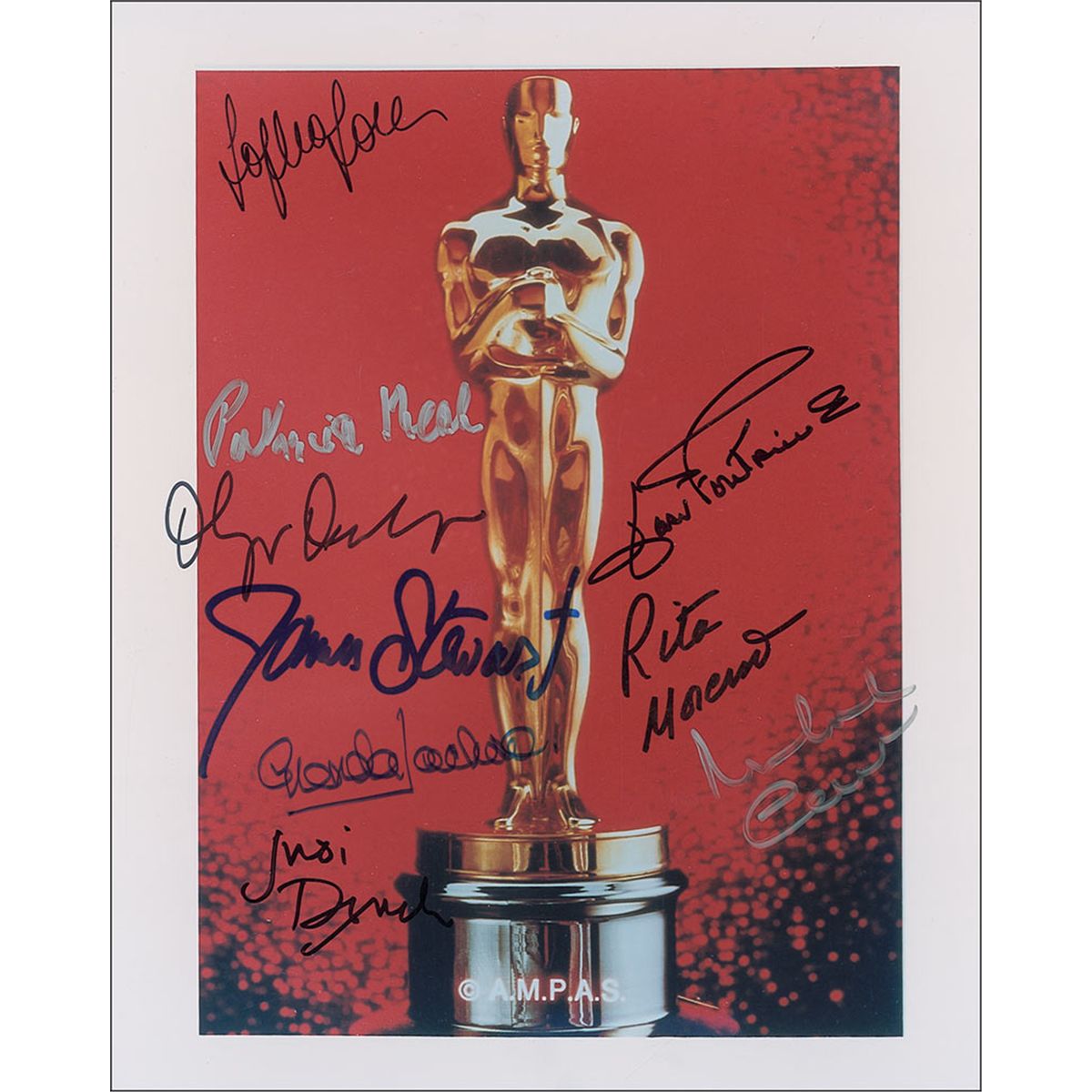 Color glossy 8 x 10 photo of an Oscar statue, signed in silver ink and felt tip by James Stewart, Sophia Loren, Patricia Neal, Olympia Dukakis, Glenda Jackson, Judi Dench, Michael Caine, Rita Moreno, and Joan Fontaine. In fine condition.