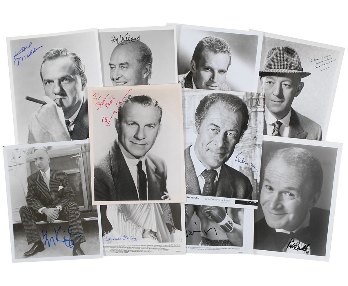 Ten photos, all 8 x 10, various finishes, each signed in ink or felt tip by the Academy Award-winning actor pictured, with some adding brief inscriptions. Signers are: George Burns, Red Buttons, Alec Guinness, Rex Harrison, Charlton Heston, Ben Kingsley, Karl Malden, Ray Milland, Laurence Olivier, and Jon Voight. In fine condition, with trimmed edges to Harrison’s photo and some scattered light creases.