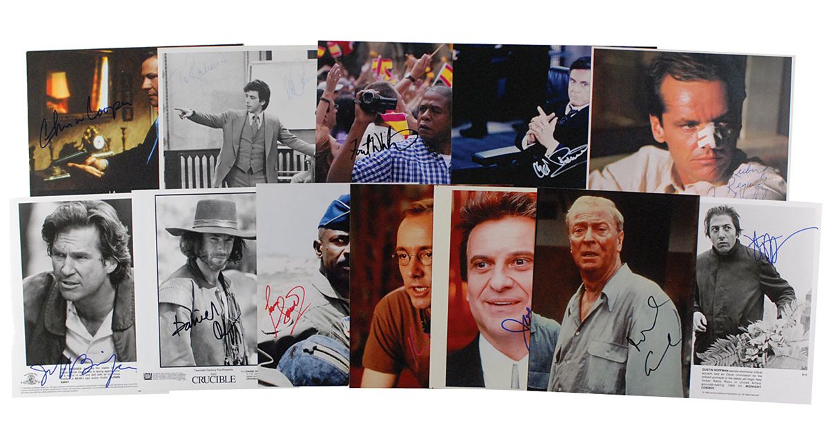 Collection of 12 photos, 8 x 10 and 10 x 8, each signed in ink by the Academy Award–winning actor pictured, including: Jack Nicholson (ins), Al Pacino (ins), Dustin Hoffman, Jeff Bridges, Daniel Day-Lewis, Michael Caine, Kevin Spacey, Joe Pesci, Chris Cooper, Cliff Robertson, Forest Whitaker, and Louis Gossett, Jr. In overall fine condition, with creases to the Cooper photo.