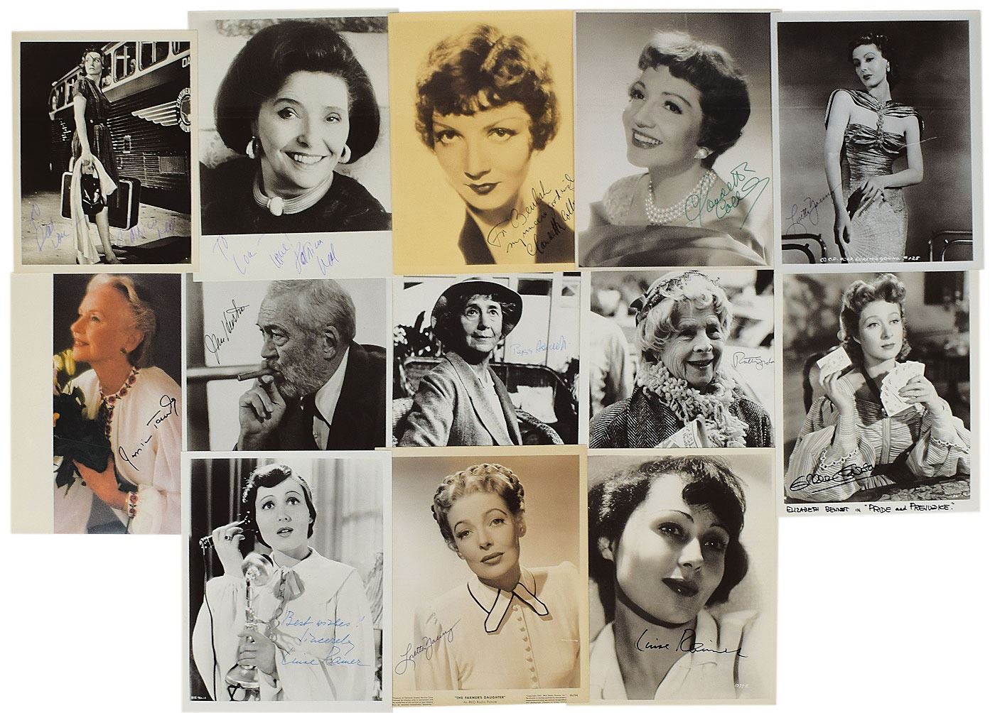Collection of thirteen photos, mostly glossy, ranging in size from 7 x 9.25 to 8 x 10.25, each signed in ink or felt tip by the pictured Oscar-winning actress or filmmaker, including: Peggy Ashcroft, Claudette Colbert (2), Greer Garson, Ruth Gordon, John Huston, Patricia Neal (2, both ins), Luise Rainer (2), Jessica Tandy, and Loretta Young (2). In overall fine condition.