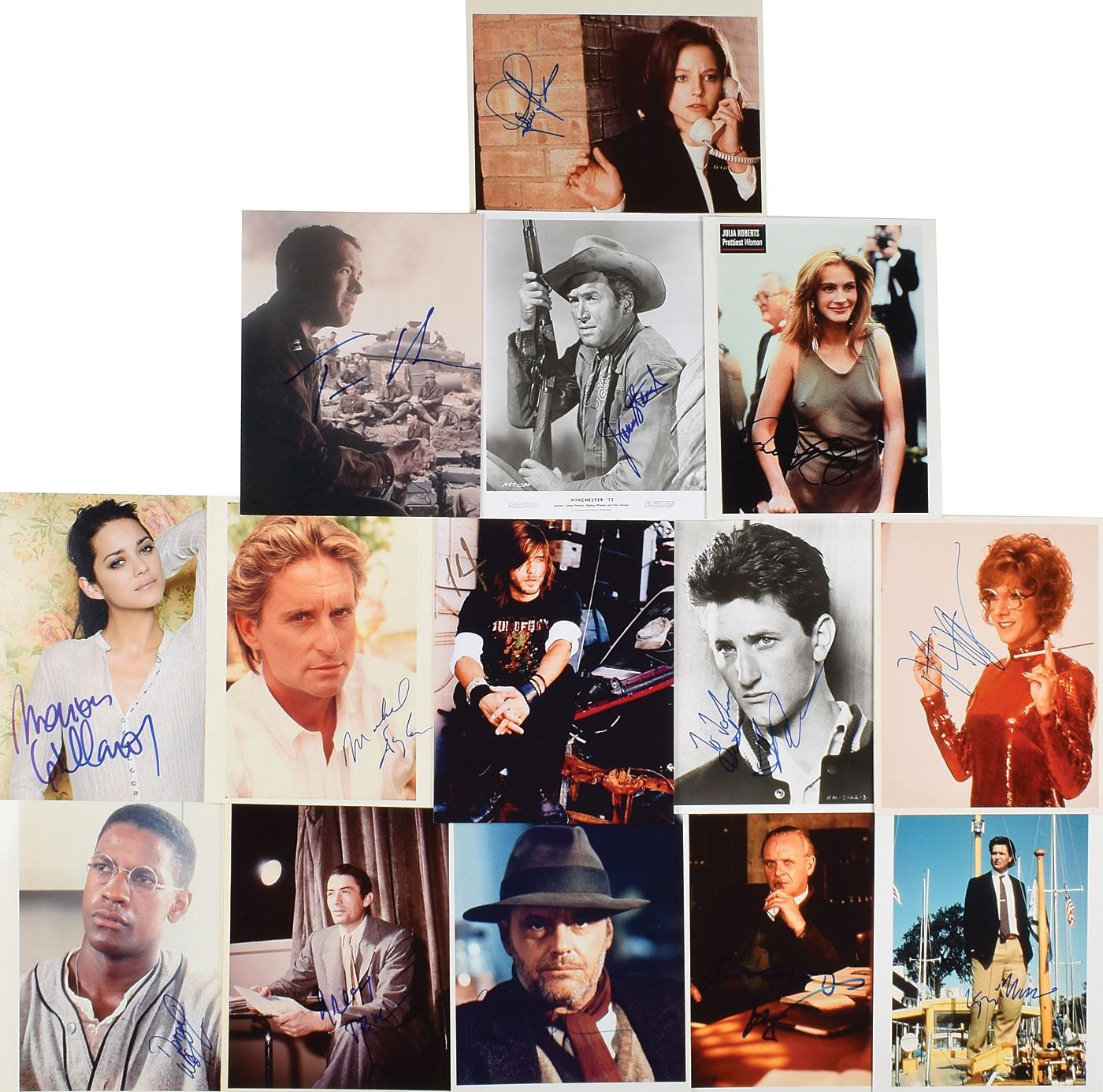 Fantastic collection of 14 glossy photos of Oscar-winning actors and actresses, each approximately measuring 8 x 10 or 10 x 8, each signed in blue or black felt tip by the pictured Academy Award recipient: Marion Cotillard, Michael Douglas, Jodie Foster, Tom Hanks, Dustin Hoffman, Anthony Hopkins, Jared Leto, Jack Nicholson, Gary Oldman, Gregory Peck, Sean Penn (ins), Julia Roberts, James Stewart, and Denzel Washington. In overall fine condition.