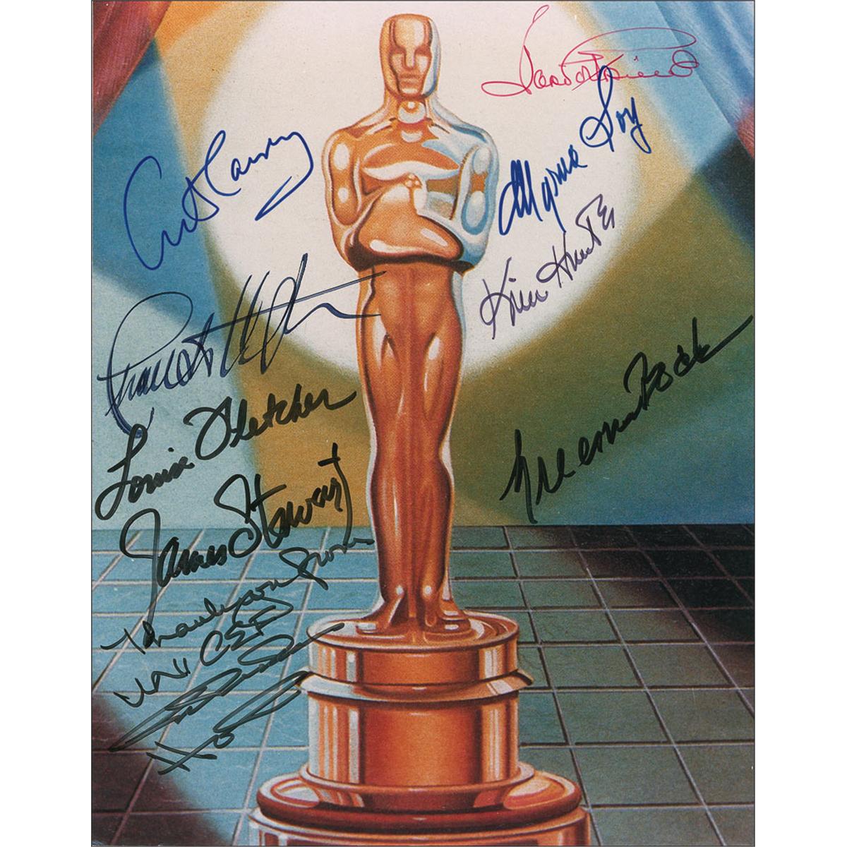 Color glossy 8 x 10 photo of an artist’s rendition of an Oscar statue, signed in various color felt tip by nine former winners: Art Carney, Charlton Heston, Louise Fletcher, James Stewart, Celeste Holm, adding “Thank you from UNICEF,” Joan Fontaine, Myrna Loy, Kim Hunter, and Gregory Peck. In very fine condition.