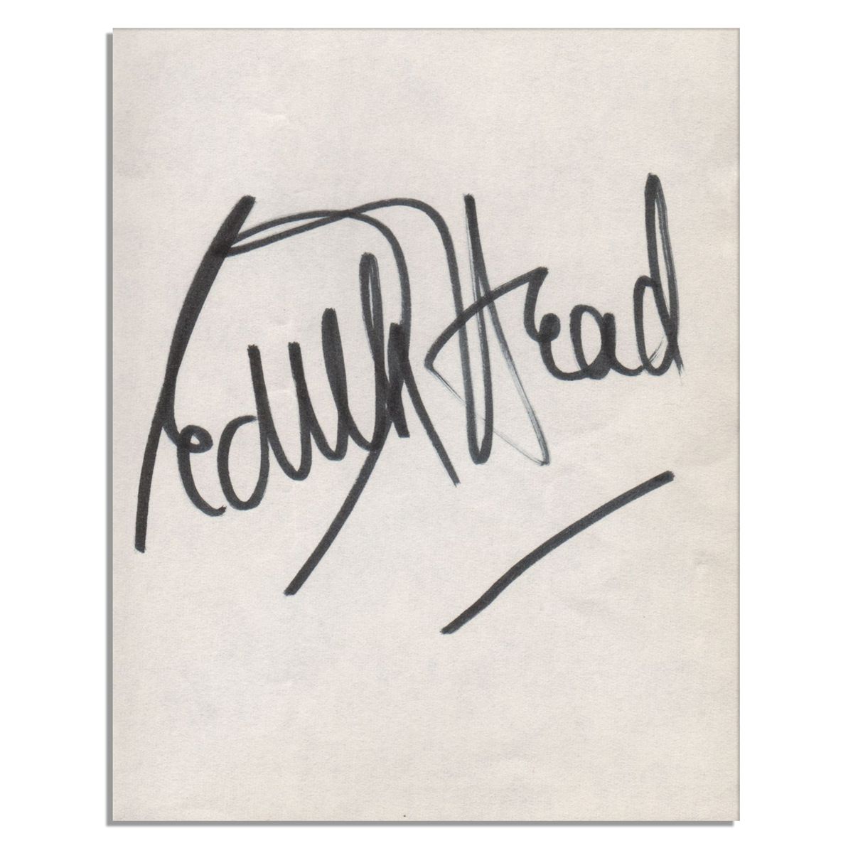 Famed 8-time Academy Award winning costume designer Edith Head signature. From ''Roman Holiday'' to ''The Birds,'' Head created costumes for some of Hollywood's most memorable films, and dressed leading ladies generation after generation. Head signs inside of a greeting card ''Edith Head'' in bold, black marker. Signature is large, measuring 3.5'' x 2.5''. Front of card depicts the First Congregational Church of Canterbury. Card measures 8'' x 5'' opened with a few minor creases running vertically, else near fine.