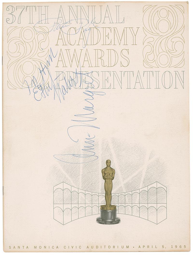 Program from the 37th Annual Academy Awards, held in Santa Monica in 1965, 9 x 12, signed on the front cover in blue ballpoint by Ann-Margret, Patti Page, and Ethel Waters. In fine condition, with some mild toning to cover.
