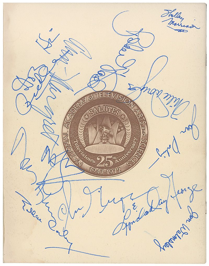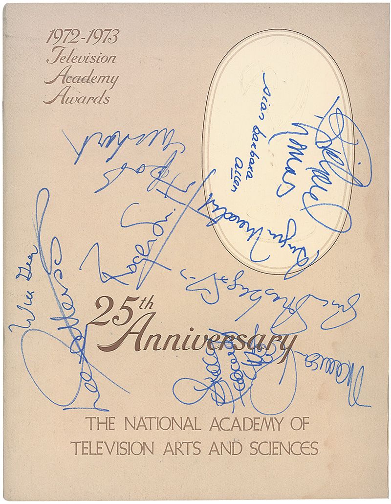 Program from the 1972–1973 Television Academy Awards, 8.5 x 11, 24 pages. Signed on the front and back cover in blue felt tip by 22 attendees including: Will Geer, Lee Patterson, Roger Smith, Bob Newhart, Burgess Meredith, Susan Strasberg, Maureen Regan, Sian Barbara Allen, Richard Thomas, Shelly Fabares, Ann-Margret, Robert Stack, Mike Douglas, Lynda Day George, and Ellen Corby. Some light dampstaining along right edge of front cover, and some light foxing to both covers, otherwise fine condition.