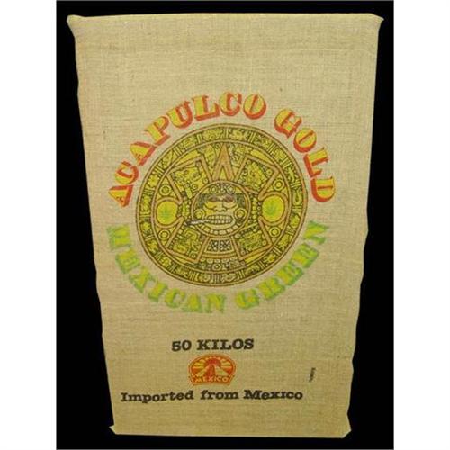 Acapulco Gold Mexican 50 kilos marijuana burlap advertisement colorfully adorned with an Aztec medallion adorned with a central figure smoking a joint, flanked by pot leaves. This advertisement has been stretched and is ready to hang on the wall, would be an interesting conversation piece and make an interesting gift or addition to any fine collection or household. ****NOTE: Email for larger images.