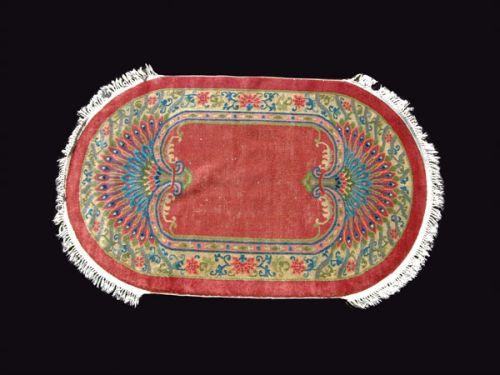 Accent Rug/ Peacock Design. Rose, blue and tan. Good condition. 3 X 5 oval.