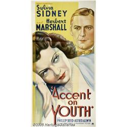 <B>Accent on Youth (Paramount, 1935)</B></I> Three Sheet (41" X 81"). This film stars the beautiful, 25-year-old Sylvia Sidney as a young secretary who is infatuated with her middle-aged playwright boss, played by the 46-year-old Herbert Marshall. Ms. Sidney sets her sights on marrying Mr.Marshall as she professes to prefer the company of older men. Other than a few small border tears this poster is in excellent condition. This large format poster features a tremendous stone litho image of the lovely Silvia Sidney. Near Mint on Linen.