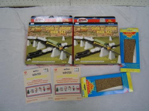 2 INC # 8852 Winter Mini people, tree, Christmas Mouse, 2 Santas , snowman, toy soldier, Midwest # 3023 cork left hand turn out pad ( 2) , # 3024 cork wye turnout pad, 2 Atlas #80 47 pc over n' under pier set