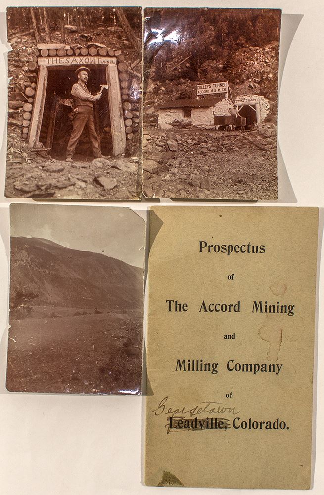 Clear Creek County. 1) Prospectus. 9 pages. 6" x 3.5" Looks to have been printed around 1905, but was written in heavily, with dates written over and whole sections crossed out. Someone was not happy with the information in this prospectus! The prospectus says the company was out of Leadville, but this has been crossed out and Georgetown has been written over it. 2) Three photographs. 4" x 2.75" One shows miner posing outside of entrance for the Saxon Tunnel. Another shows a miner and ore carts outside of Culley's Tunnel (Accord M & M Co. on sign next to tunnel). The third picture shows a valley and mountains. J.J. Culley was the owner, President and Treasurer of Accord Mining and Milling Company in the early 1900s.