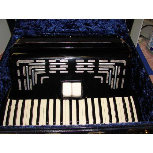 White mother of pearl with chrome grill. 120bass 41 treble. Serial #6498. Alligator velvet lined case with keys.