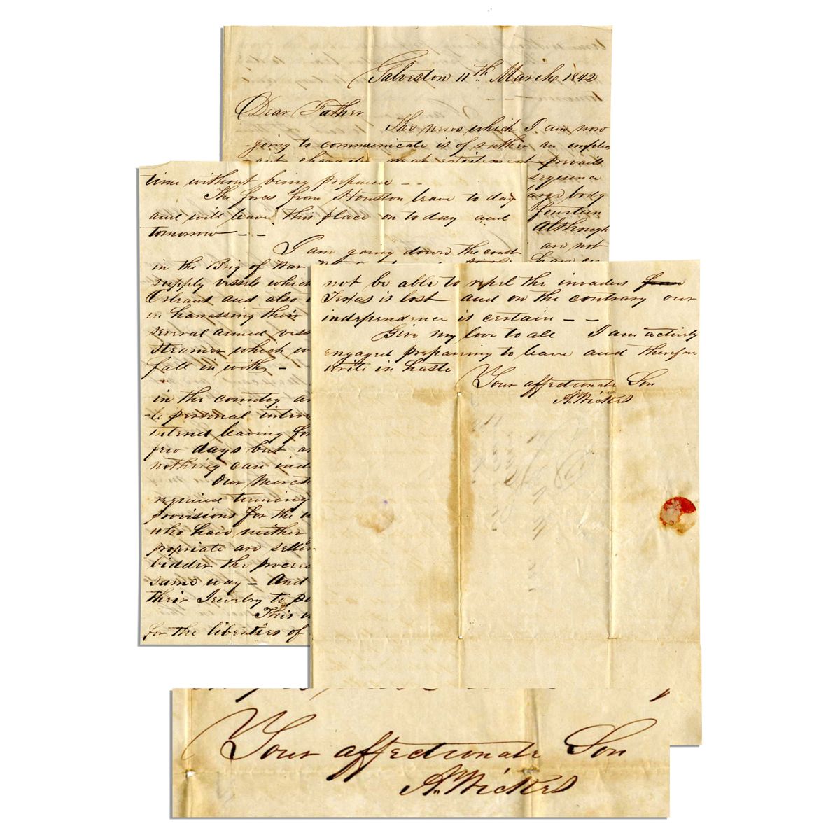 Autograph letter signed from Galveston, Republic of Texas, dated 11 March 1842, during the first of two attacks Santa Anna would make against Texas that year. The letter, written to the unidentified author's father in New York, describes a ''body of Mexicans...fourteen to twenty thousand strong...'' The three page letter reads in part: ''...although it is generally said Mexicans are not men of military talent they have certainly planned this expedition admirably and with great secrecy. The first intimation we had except vague rumor was not more than four days since and there are now more than fourteen thousand Mexicans this side of the Rio Grande nearly all our frontier towns are taken and the people falling back. The citizens throughout this portion of the country are turning out almost en masse. We shall try and meet them west of the Colorado...Santa Anna has been foiled once in this country and has not come the second time without being prepared. The forces from Houston leave to day and will leave this place on today and tomorrow. I am going down the coast in the Brig of War Wharton to cut off their supply vessels which are expected from New Orleans...Should we not be able to repel the invaders Texas is lost...'' Minor separation to folds of 7.75'' x 9.25'' card style letter with remnants of red wax seal. Overall in very good condition. A fascinating piece of Texas history unfolds on the pages of this letter.