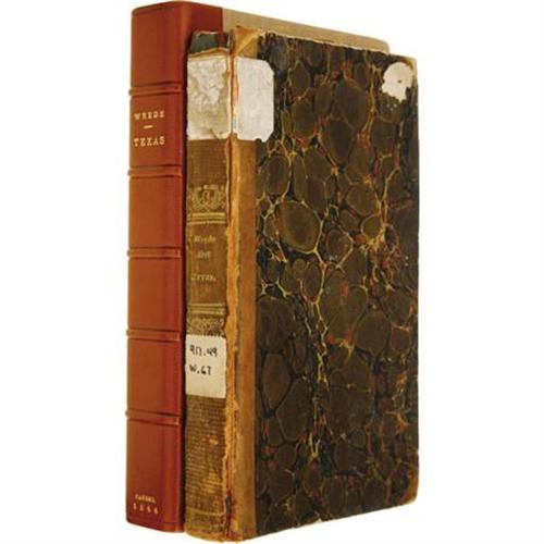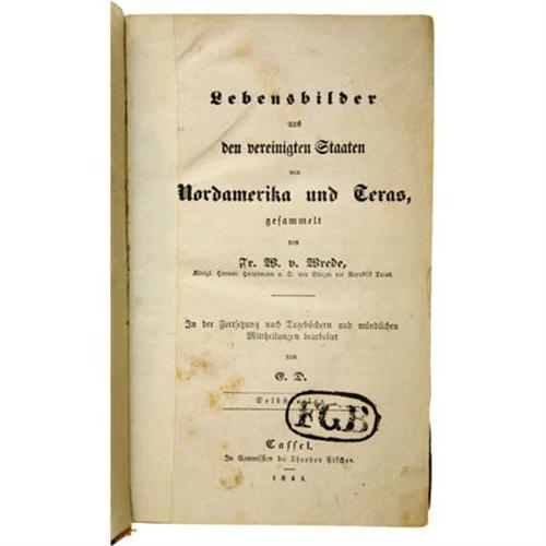 <B>Fr[iedrich] W. V[on] Wrede: </B></I><B><I>Lebensbilder aus den verenigten Staaten von Nordamerika und Texas.</B></I></B></I> <I>In der Fortsetzung nach Tagebuchern und mundlichen Mittheilungen bearbeitet. Vorwort von Emil Drescher. </B></I>(Cassel: In Commission bei Theodor Fischer, 1844). First edition. Octavo (7.5" x 4.5"). v, 324 pages. Contemporary calf back over marbled boards, stamped and lettered in gilt on the spine. Streeter <I>Texas</B></I> 1560: "These Lebensbilder include accounts of three visits to Texas made by Captain Wrede, a retired officer of the Hannover army, who came to the United States in the year 1835. The first Texas visit was from February to May, 1836, the second from May to September, 1838, and the third from May to September, 1841. Excellent source materials for conditions in Texas at the time." Raunick, <I>Survey of German Literature in Texas</B></I> p.136: "It is said to have influenced many wavering Germans to sell their belongings and immigrate to Texas." "Wrede's Sketches, an epistolary travel book, is a generally realistic account of opportunities and difficulties of colonists on the American frontier, especially in Texas. The book helped to influence prospective German settlers to come to Texas, in spite the negative effect of Wrede's own violent death in Texas the following year. He was killed and scalped by Indians." (Handbook of Texas On-line). Binding worn and partially perished at the top of the spine, joints and corners, joints starting. Ex-library copy, with labels or remnants of labels on the spine and endpapers, and with ink stamps to the top edge and to the title page. Front free endpaper torn at bottom fore-edge corner with some loss. Sheets browned and foxed. Altogether, a very good copy. Housed in a custom cloth chemise and quarter leather book-backed slipcase. <I>From the collection of Darrel Brown.</B></I><BR><BR><B>Reference:</B></I> Graff 4751. Howes W690. Buck 305. Streeter 1560, locating only seven copies.<BR><BR><b>Shipping:</b> Books & Catalogs (<a target="_blank" href="http://www.heritageauctions.com/common/shipping.php">view shipping information</a>)