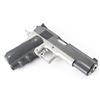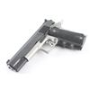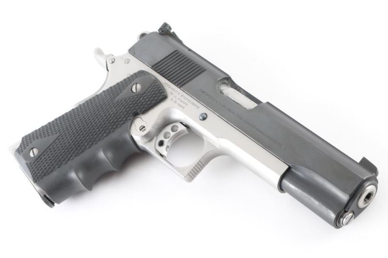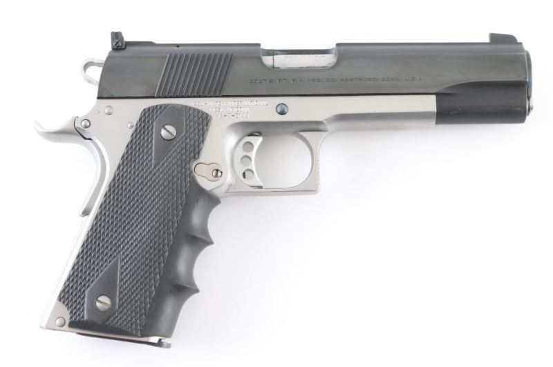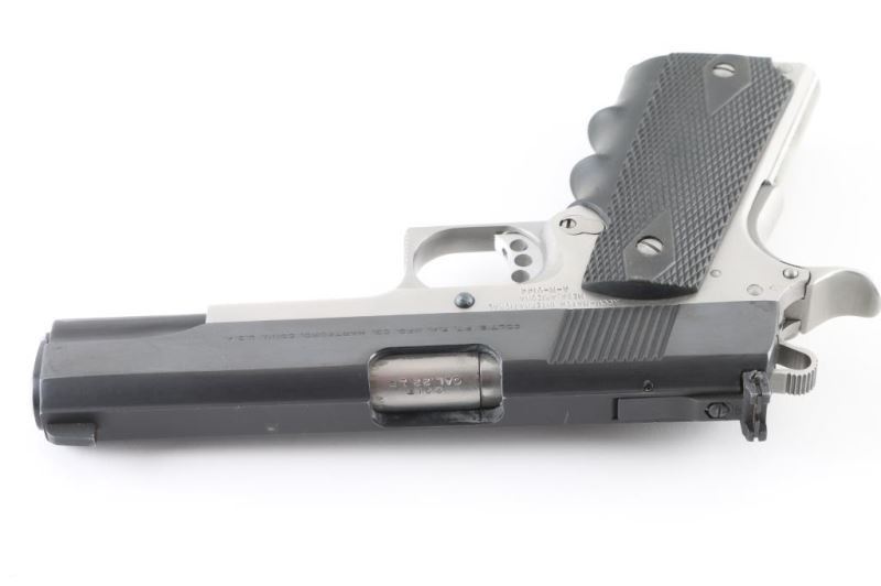 Pistol. Semi-Automatic. 10-rd magazine. SN: A-M-0144 'Colt Conversion Unit' Introduced in 1947. This one has the Accro adjustable rear sight, and slanted slide serrations, introduced in 1953. Left slide marked "Conversion Unit Colt Automatic Cal. 22 L.R. with Rampant Colt" One line Colt address on right slide. Blued finish. Colt barrel. Mounted on a Accu-Match International, Mesa, AZ, Frame. Stainless steel with Combat triggerguard, Skeletonized, serrated trigger, with adjustable stop. Straight, serrated , mainspring housing. Black rubber, checkered, finger-grooved, wrap-around grips. Skeletonized hammer. Grip/thumb safeties. Slide action is smooth/tight. Bore appears very good/bright, but dirty. Grips are excellent. Blued finish is about 99%, with very minor edge wear/scratches. Comes with correct Colt marked magazine. NRA Condition-Very Good. Modern firearm.