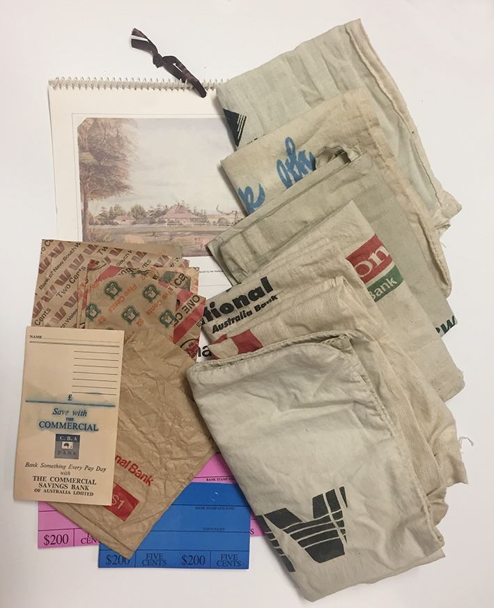 Selection of paper mint roll paper wrappers, National Bank paper bags and bank bag tags for Five & Ten Cents,: together with cloth coin bags for ANZ, Bendigo, National, Colonial, Commonwealth (2, different), Credit Union; plus National Bank calendar, 1980 (lot)