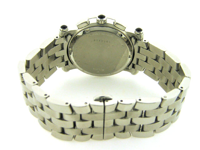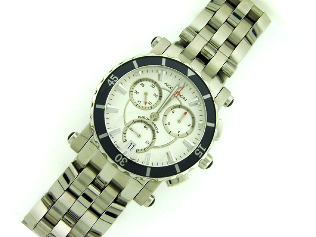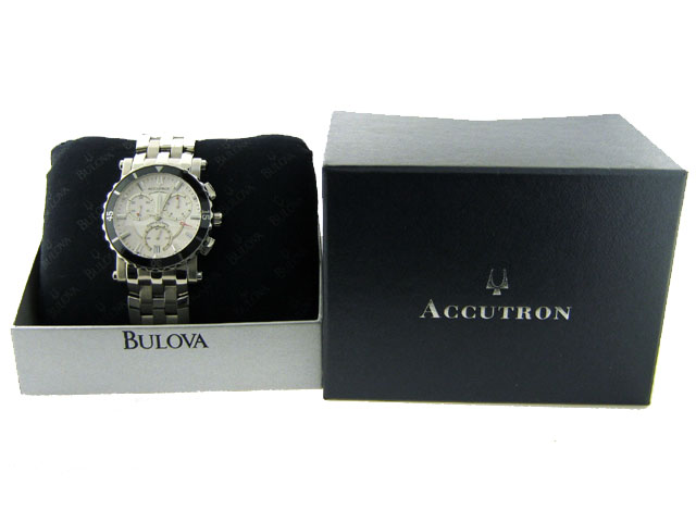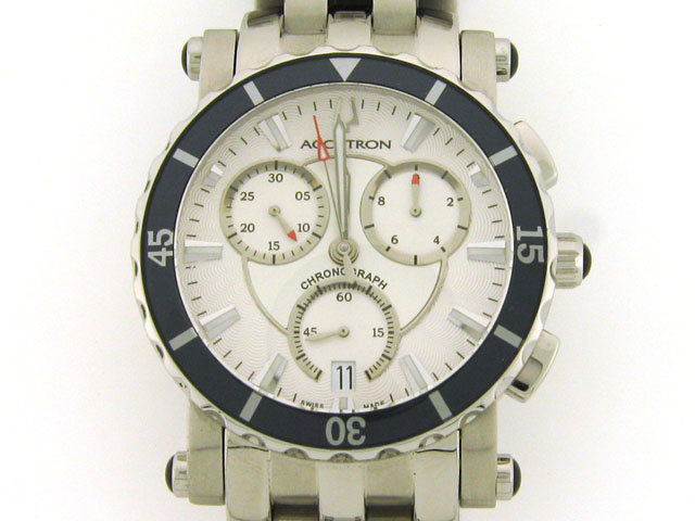 This is an Accutron Courchevel Men's Watch - 26B7 with the following features: Stainless steel case and bracelet; Chronograph; White dial; White luminous hands; Domed sapphire crystal; Black cabochon crown and lug ends; Deployment buckle closure with loc