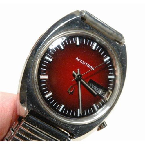 ccutron by Bulova Men's Date Watch. It features the Tuning fork symbol above the 6:00 on a maroon or wine colored dial that at the perimeter the shade gradually gets darker. <p> The steel cushion case measure 1 ¼ x 1 5/8?. The hour indicators have luminescent panels. <p> The hour and minute hand have luminescent panels. The second hand has a sweeping movement with out hesitation. <p>The date window is at the 3:00 mark. It has an off center crown. <p>The mineral crystal is 1 1/4". <p>In comes on Speidel twist-o-flex band. The condition is very good for this watch. There are only a few very tiny microscopic scratches to the crystal that cannot bee seen with the naked eye. They are only really noticeable upon careful inspection and high magnification of a jewelers loop.