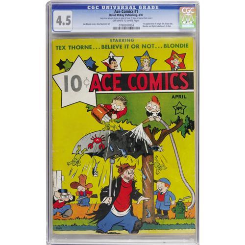 <B>Ace Comics #1 (David McKay Publications, 1937) CGC VG+ 4.5 Off-white to white pages.</B></I> Four beloved features made their very first comic book appearances in this issue: Blondie, Krazy Kat, Jungle Jim (with art by Alex Raymond), and Ripley's Believe it or Not. Like many a book hailing from the Platinum Age, this one is rated "scarce" by Gerber. Although it is housed in a blue Universal holder, CGC notes, "Very minor amount of glue on spine of cover. (One piece of tape on back cover.)" Overstreet 2006 VG 4.0 value = $632. CGC census 9/06: 1 in 4.5, 4 higher. <I>From the Simon Powell Collection.</B></I><BR><BR><b>Shipping:</b> Slabbed Comic (<a target="_blank" href="http://www.heritageauctions.com/common/shipping.php">view shipping information</a>)