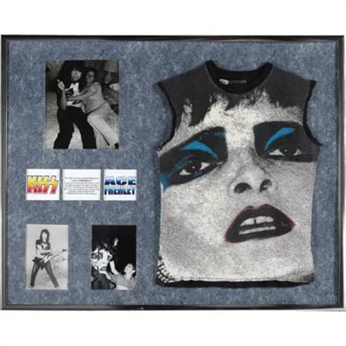 <B>Ace Frehley Owned and Stage-Worn Shirt.</B></I> Even after he left Kiss, Frehley was "dressed to kill." This Modzart sleeveless number was stage-worn by Frehley, with a gorgeous image of Siouxsie Sioux emblazoned across the front. Who would've guessed Frehley was a Siouxsie and the Banshees fan? Three photos of Frehley wearing the shirt accompany the lot -- two of which are autographed by the Spaceman. In Excellent condition, framed to an overall size of 29" x 36".<BR><BR><b>Shipping:</b> Framed - with Glass, Large (<a target="_blank" href="http://www.heritageauctions.com/common/shipping.php">view shipping information</a>)