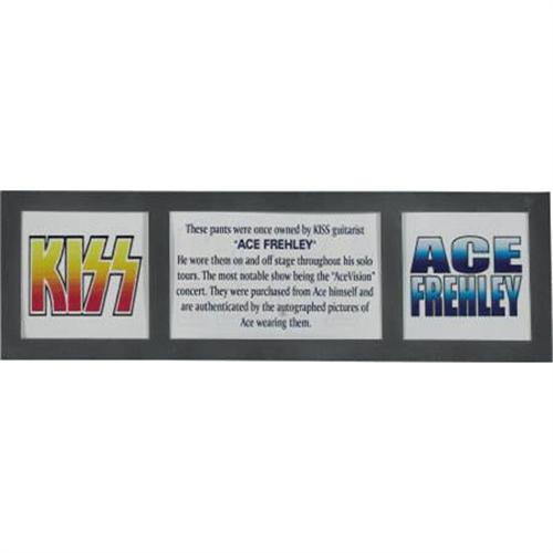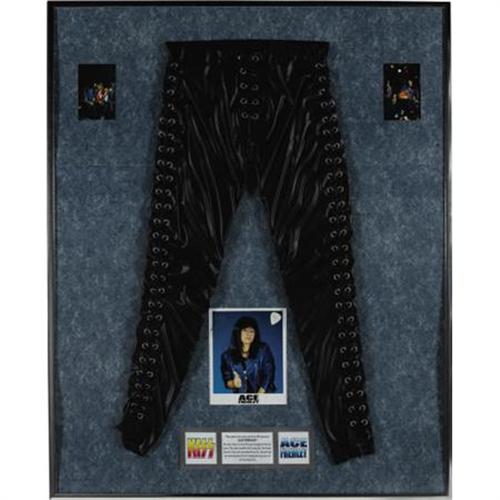 <B>Ace Frehley Stage-Worn Pants.</B></I> A pair of faux-leather pants stage-worn by Ace Frehley on a solo tour, with laced front and side seams, and accompanied by photos of the Spaceman wearing the pants onstage. Framed to an overall size of 39" x 48", the display is in Excellent condition and is accompanied by photos of the Spaceman wearing the pants onstage, and an autographed 8" x 10" photo and guitar pick.<BR><BR><b>Shipping:</b> Framed - with Glass, Large (<a target="_blank" href="http://www.heritageauctions.com/common/shipping.php">view shipping information</a>)
