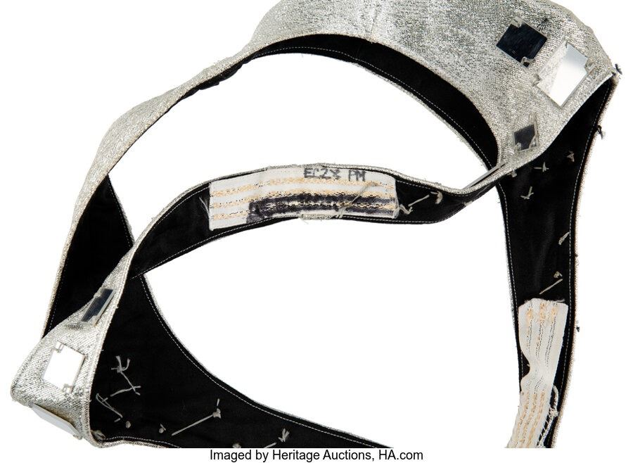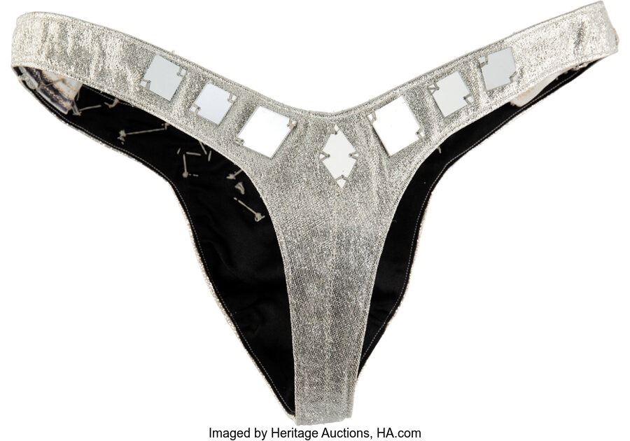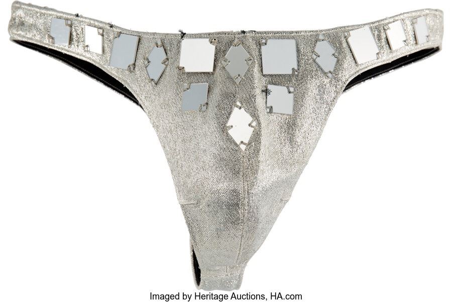Ace Frehley Worn Silver Mirrored Crotch Garment. A silver colored (with mini mirrors sewn on the front and back) crotch garment worn by original Kiss guitarist Ace Frehley for a TV special. Comes with a tag featuring "1982" written on it attached by a pin. Attaches on the right side of the waist. Measures approx. 15" waist. In Very Good Plus condition with wear on the mirrors and loose threading. COA from Heritage Auctions.
