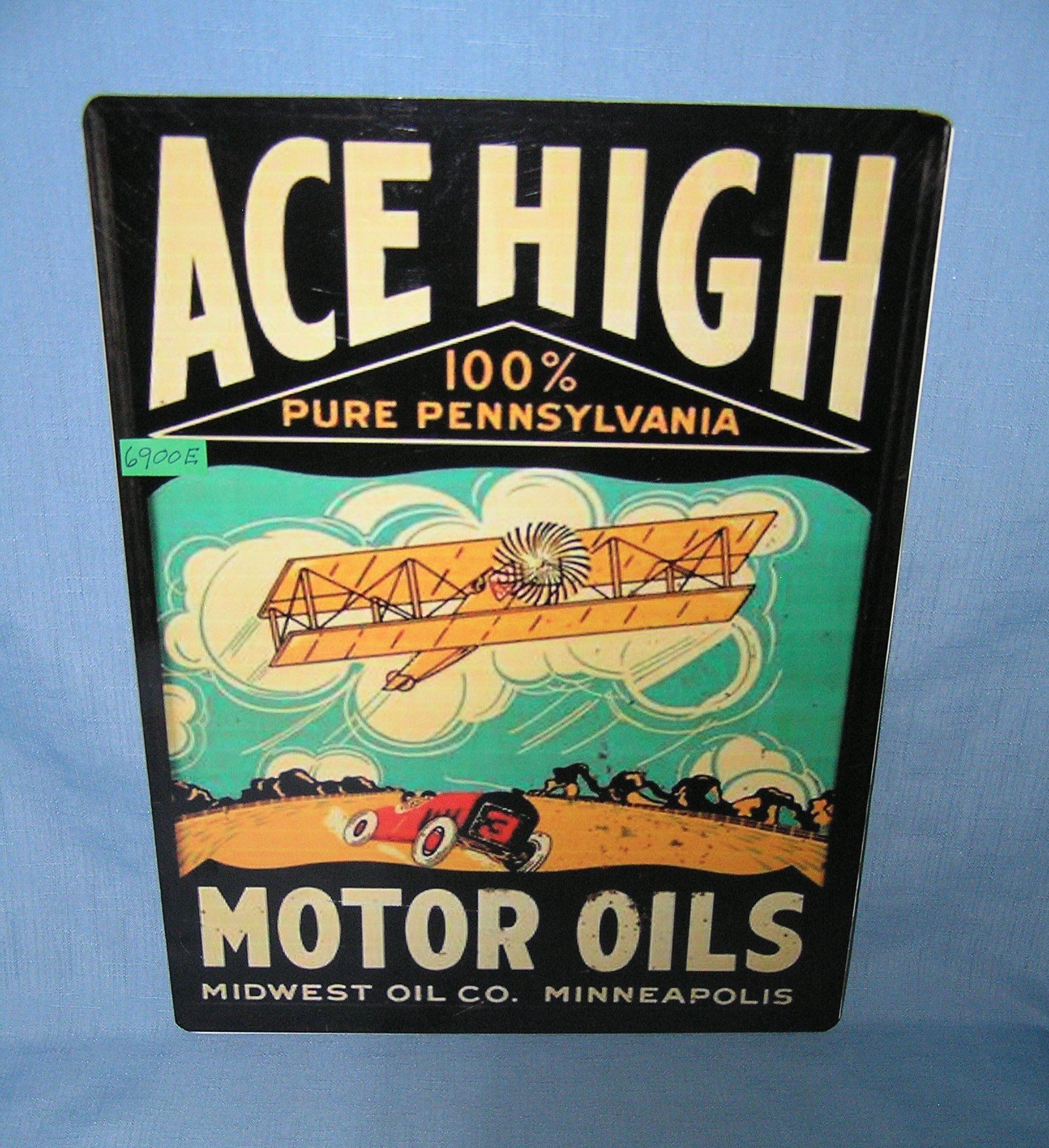Ace High Motor Oils  retro style advertising sign printed on PVC hardboard these signs are auctioned for their decorative and display purposes 12 inches by 16 inches est. value $50.00-$60.00