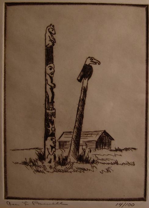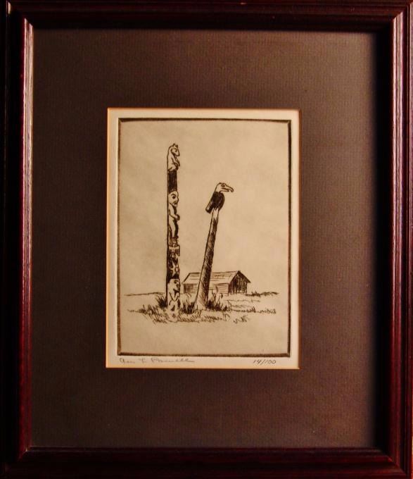 totem poles and cabin in background, 7" x 5-1/2" sight size, pencil signed lower left, numbered 14 out of 100, very nice chop and join frame, -562554-sml