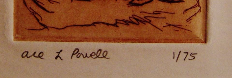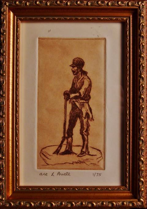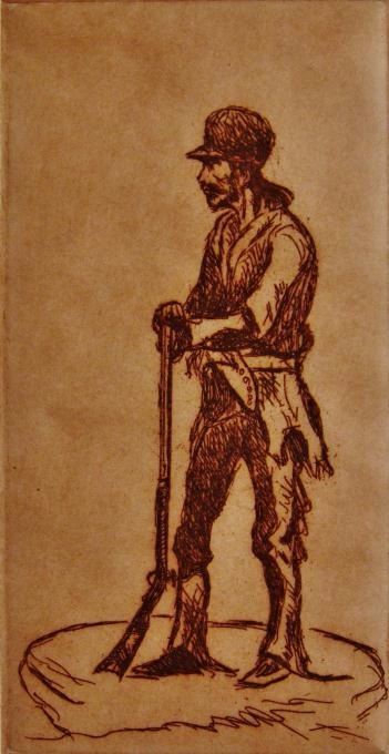 man standing with rifle, 7" x 4-1/2" sight size, pencil signed lower left, numbered 1 out of 75, very nice chop and join frame, 9" x 6-1/2" overall, -562610-sml