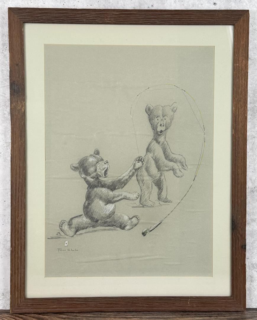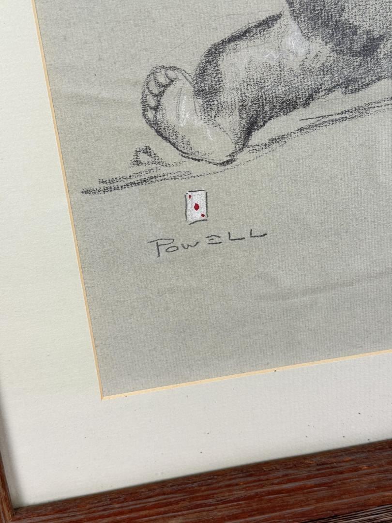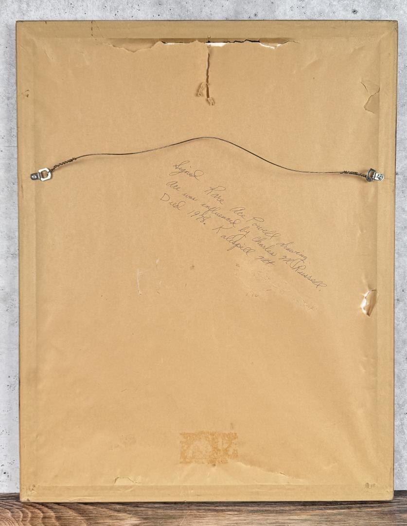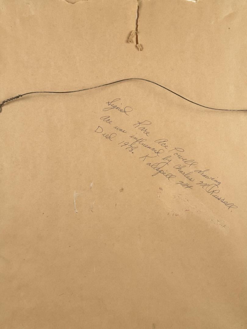 Title is Hooked. 16" by 22" unframed. 22" by 28" framed. Pastel on Paper. Ace (Asa Lynn) Powell (1912 - 1978) was active/lived in Montana, New Mexico. Ace Powell is known for Cowboy genre and Indian figure painting. Born in Tularosa, New Mexico, Ace Powell became a painter of western action scenes, wild animals, and Indian figures in realistic style and in the tradition of Charles Russell. Powell's trademark signature on his paintings is the ace of diamonds, which also became his nickname. He was prolific, creating between 12,000 and 15,000 paintings and sculptures. He considered oil to be his best medium although he loved sculpting in terra cotta, stone, and wood. He also was skilled at etching. His life has involved many changes of location and personal circumstance, much of it due to his alcoholism, which he eventually overcame. Eventually he settled in Kalispell. He moved to Montana at age one month. His mother was a schoolteacher, and his father was a cowboy foreman on the Ben Steven's horse ranch, then a homesteader, and eventually a worker for the Glacier National Park Service. Charlie Russell' s summer home was near the Powell home, and the Russells were family friends and encouraged Asa, nicknamed "Ace" in his artistic talent. He loved the Blackfeet Indians so much his father sent him to school on their reservation, and these people became one of his most frequent subjects. He also worked on the Bar X Six Ranch where he was a saddle-horse guide for many visiting successful western artists. He built a studio in Choteau, Montana and from there worked as a wood animal sculptor and also did book illustrations. After his first wife died when he was 29, he was briefly in the Army, worked in a defense plant, and was in the plastic figurine business in Yakima, Washington, but his partner ran off with his second wife, obviously terminating their business arrangement. He returned to Glacier Park for six years with his young son and then at age 40 enrolled in the University of Montana on the G.I. Bill. But he disliked the abstract art being promoted, so he quit and took the Famous Artists correspondence course, which really helped him down the path that established his art career. In 1952, he married artist Nancy McLaughlin, and in Hungry Horse, Montana they successfully operated a gallery, but it burned to the ground in 1964. They divorced, and in 1965, he married Thelma Conner.