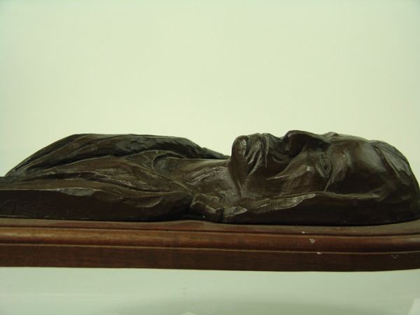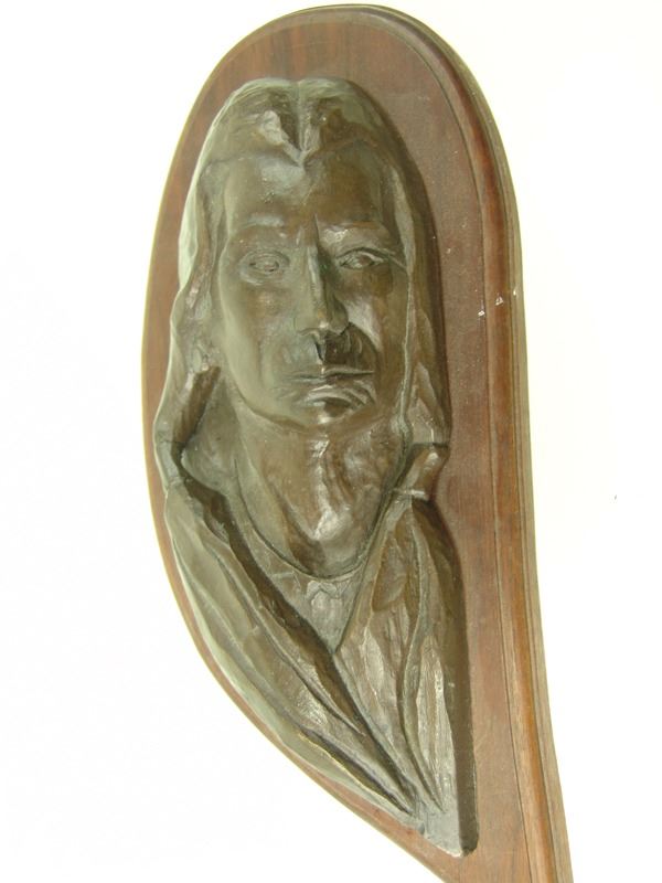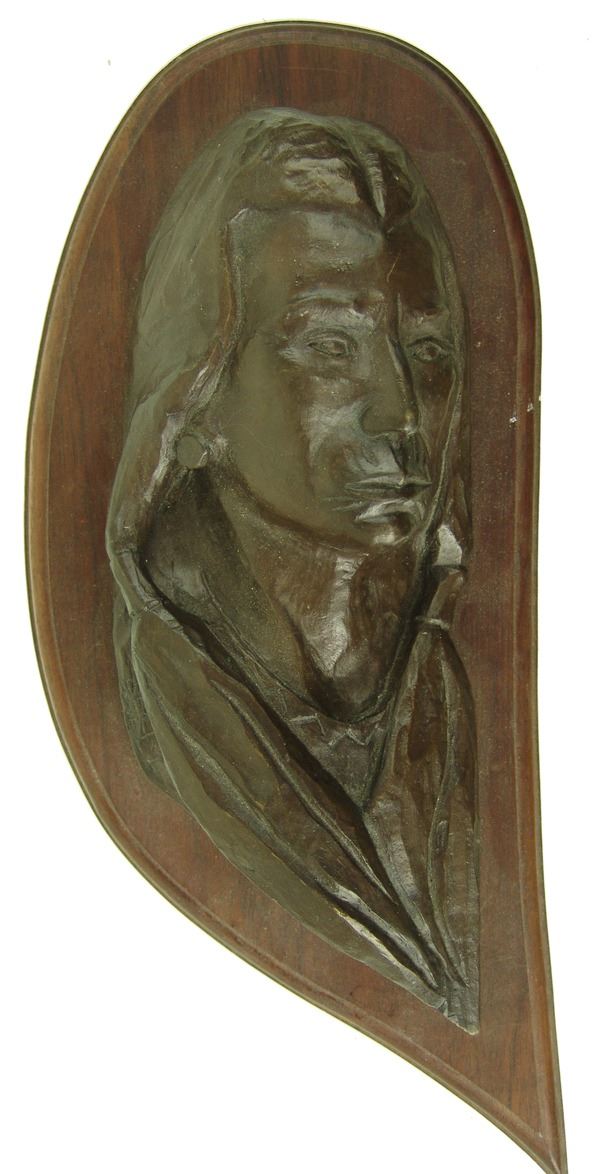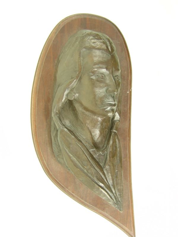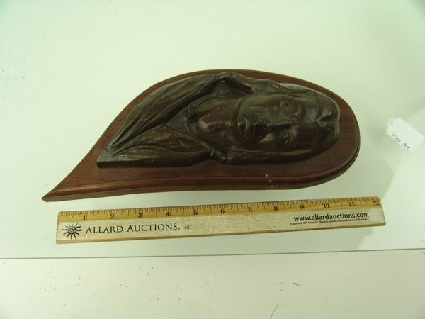 Mid/Late 1900s 9-3/4" x 3-1/2" x 2" Sculpture of an Indian man in semi-profile, mounted on a wooden plaque. Very good condition.