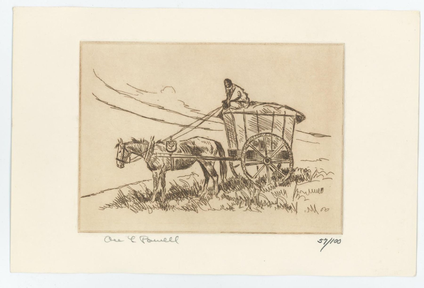 7" by 10 1/2". Ace (Asa Lynn) Powell (1912 - 1978) was active/lived in Montana, New Mexico. Ace Powell is known for Cowboy genre and Indian figure painting. Born in Tularosa, New Mexico, Ace Powell became a painter of western action scenes, wild animals, and Indian figures in realistic style and in the tradition of Charles Russell. Powell's trademark signature on his paintings is the ace of diamonds, which also became his nickname. He was prolific, creating between 12,000 and 15,000 paintings and sculptures. He considered oil to be his best medium although he loved sculpting in terra cotta, stone, and wood. He also was skilled at etching. His life has involved many changes of location and personal circumstance, much of it due to his alcoholism, which he eventually overcame. Eventually he settled in Kalispell. He moved to Montana at age one month. His mother was a schoolteacher, and his father was a cowboy foreman on the Ben Steven's horse ranch, then a homesteader, and eventually a worker for the Glacier National Park Service. Charlie Russell' s summer home was near the Powell home, and the Russells were family friends and encouraged Asa, nicknamed "Ace" in his artistic talent. He loved the Blackfeet Indians so much his father sent him to school on their reservation, and these people became one of his most frequent subjects. He also worked on the Bar X Six Ranch where he was a saddle-horse guide for many visiting successful western artists. He built a studio in Choteau, Montana and from there worked as a wood animal sculptor and also did book illustrations. After his first wife died when he was 29, he was briefly in the Army, worked in a defense plant, and was in the plastic figurine business in Yakima, Washington, but his partner ran off with his second wife, obviously terminating their business arrangement. He returned to Glacier Park for six years with his young son and then at age 40 enrolled in the University of Montana on the G.I. Bill. But he disliked the abstract art being promoted, so he quit and took the Famous Artists correspondence course, which really helped him down the path that established his art career. In 1952, he married artist Nancy McLaughlin, and in Hungry Horse, Montana they successfully operated a gallery, but it burned to the ground in 1964. They divorced, and in 1965, he married Thelma Conner.