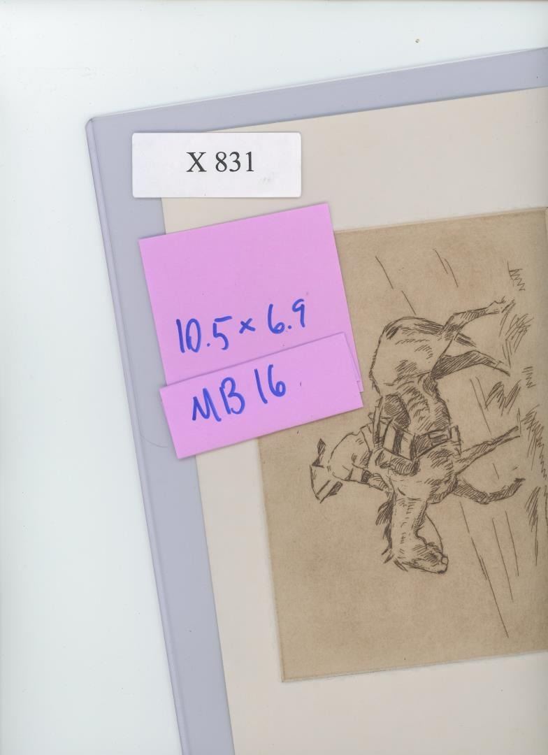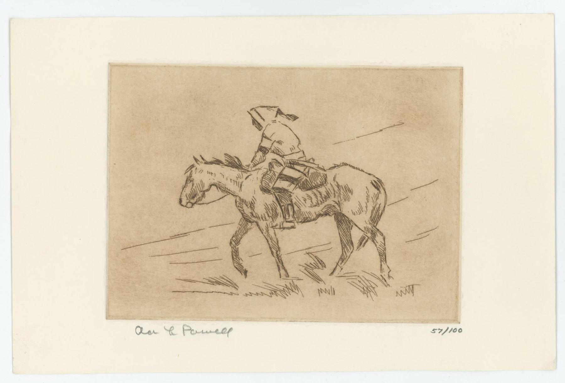 7" by 10 1/2". Ace (Asa Lynn) Powell (1912 - 1978) was active/lived in Montana, New Mexico. Ace Powell is known for Cowboy genre and Indian figure painting. Born in Tularosa, New Mexico, Ace Powell became a painter of western action scenes, wild animals, and Indian figures in realistic style and in the tradition of Charles Russell. Powell's trademark signature on his paintings is the ace of diamonds, which also became his nickname. He was prolific, creating between 12,000 and 15,000 paintings and sculptures. He considered oil to be his best medium although he loved sculpting in terra cotta, stone, and wood. He also was skilled at etching. His life has involved many changes of location and personal circumstance, much of it due to his alcoholism, which he eventually overcame. Eventually he settled in Kalispell. He moved to Montana at age one month. His mother was a schoolteacher, and his father was a cowboy foreman on the Ben Steven's horse ranch, then a homesteader, and eventually a worker for the Glacier National Park Service. Charlie Russell' s summer home was near the Powell home, and the Russells were family friends and encouraged Asa, nicknamed "Ace" in his artistic talent. He loved the Blackfeet Indians so much his father sent him to school on their reservation, and these people became one of his most frequent subjects. He also worked on the Bar X Six Ranch where he was a saddle-horse guide for many visiting successful western artists. He built a studio in Choteau, Montana and from there worked as a wood animal sculptor and also did book illustrations. After his first wife died when he was 29, he was briefly in the Army, worked in a defense plant, and was in the plastic figurine business in Yakima, Washington, but his partner ran off with his second wife, obviously terminating their business arrangement. He returned to Glacier Park for six years with his young son and then at age 40 enrolled in the University of Montana on the G.I. Bill. But he disliked the abstract art being promoted, so he quit and took the Famous Artists correspondence course, which really helped him down the path that established his art career. In 1952, he married artist Nancy McLaughlin, and in Hungry Horse, Montana they successfully operated a gallery, but it burned to the ground in 1964. They divorced, and in 1965, he married Thelma Conner.