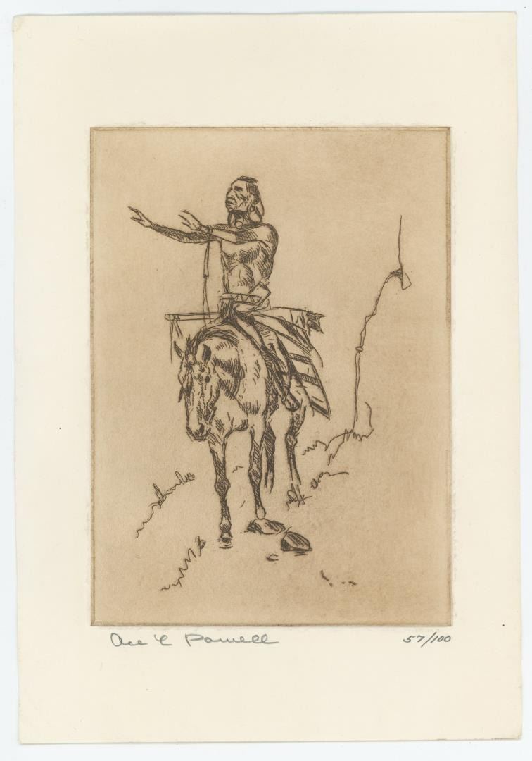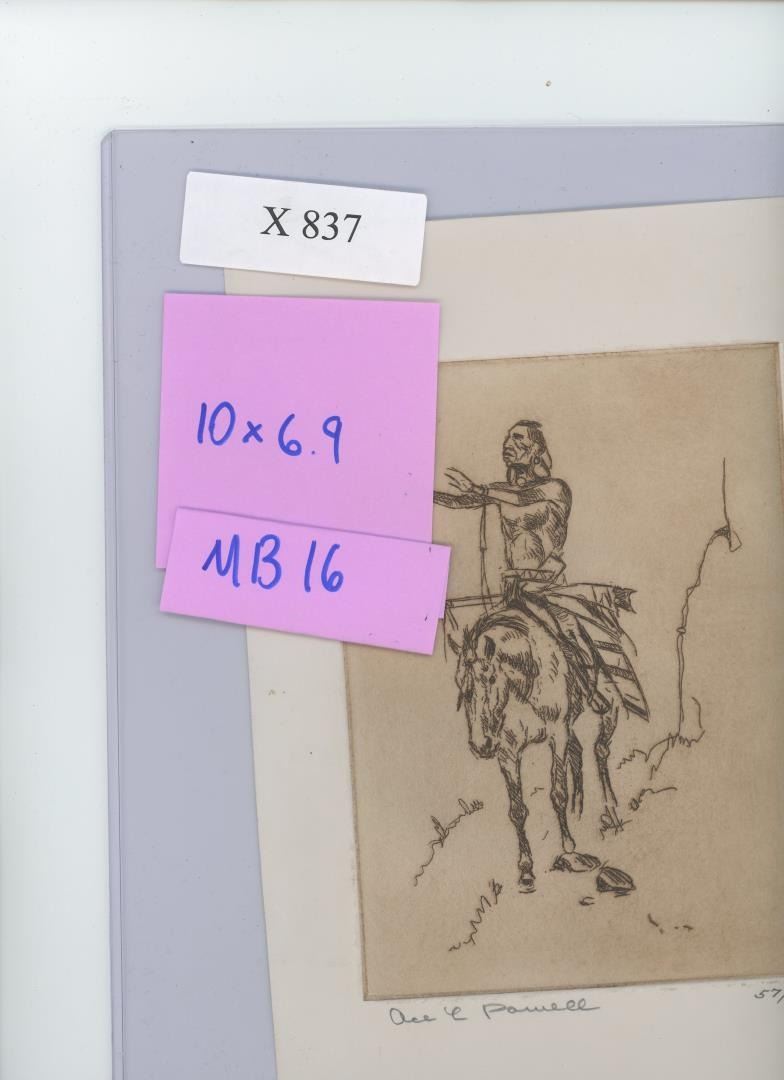 7" by 10". Ace (Asa Lynn) Powell (1912 - 1978) was active/lived in Montana, New Mexico. Ace Powell is known for Cowboy genre and Indian figure painting. Born in Tularosa, New Mexico, Ace Powell became a painter of western action scenes, wild animals, and Indian figures in realistic style and in the tradition of Charles Russell. Powell's trademark signature on his paintings is the ace of diamonds, which also became his nickname. He was prolific, creating between 12,000 and 15,000 paintings and sculptures. He considered oil to be his best medium although he loved sculpting in terra cotta, stone, and wood. He also was skilled at etching. His life has involved many changes of location and personal circumstance, much of it due to his alcoholism, which he eventually overcame. Eventually he settled in Kalispell. He moved to Montana at age one month. His mother was a schoolteacher, and his father was a cowboy foreman on the Ben Steven's horse ranch, then a homesteader, and eventually a worker for the Glacier National Park Service. Charlie Russell' s summer home was near the Powell home, and the Russells were family friends and encouraged Asa, nicknamed "Ace" in his artistic talent. He loved the Blackfeet Indians so much his father sent him to school on their reservation, and these people became one of his most frequent subjects. He also worked on the Bar X Six Ranch where he was a saddle-horse guide for many visiting successful western artists. He built a studio in Choteau, Montana and from there worked as a wood animal sculptor and also did book illustrations. After his first wife died when he was 29, he was briefly in the Army, worked in a defense plant, and was in the plastic figurine business in Yakima, Washington, but his partner ran off with his second wife, obviously terminating their business arrangement. He returned to Glacier Park for six years with his young son and then at age 40 enrolled in the University of Montana on the G.I. Bill. But he disliked the abstract art being promoted, so he quit and took the Famous Artists correspondence course, which really helped him down the path that established his art career. In 1952, he married artist Nancy McLaughlin, and in Hungry Horse, Montana they successfully operated a gallery, but it burned to the ground in 1964. They divorced, and in 1965, he married Thelma Conner.