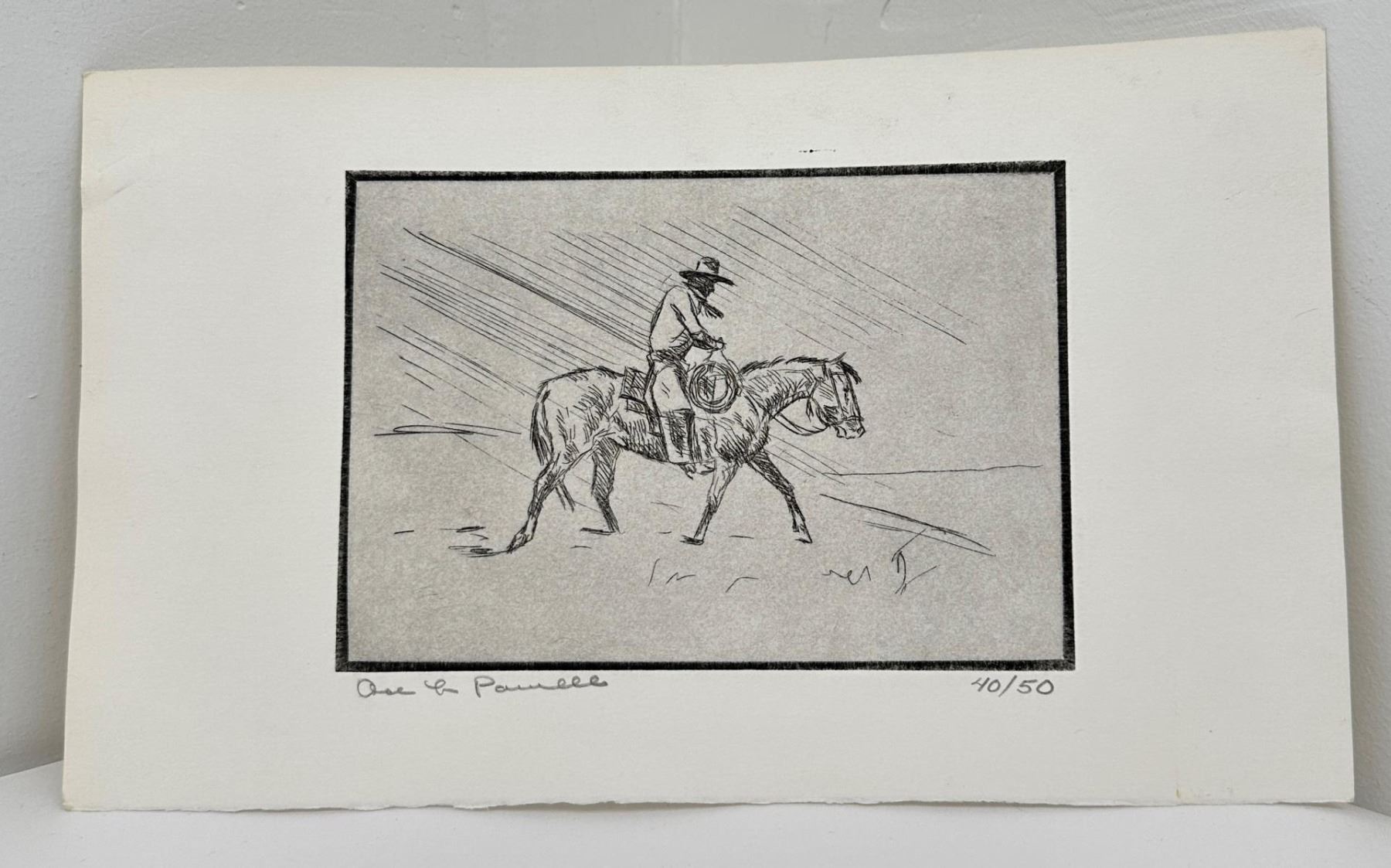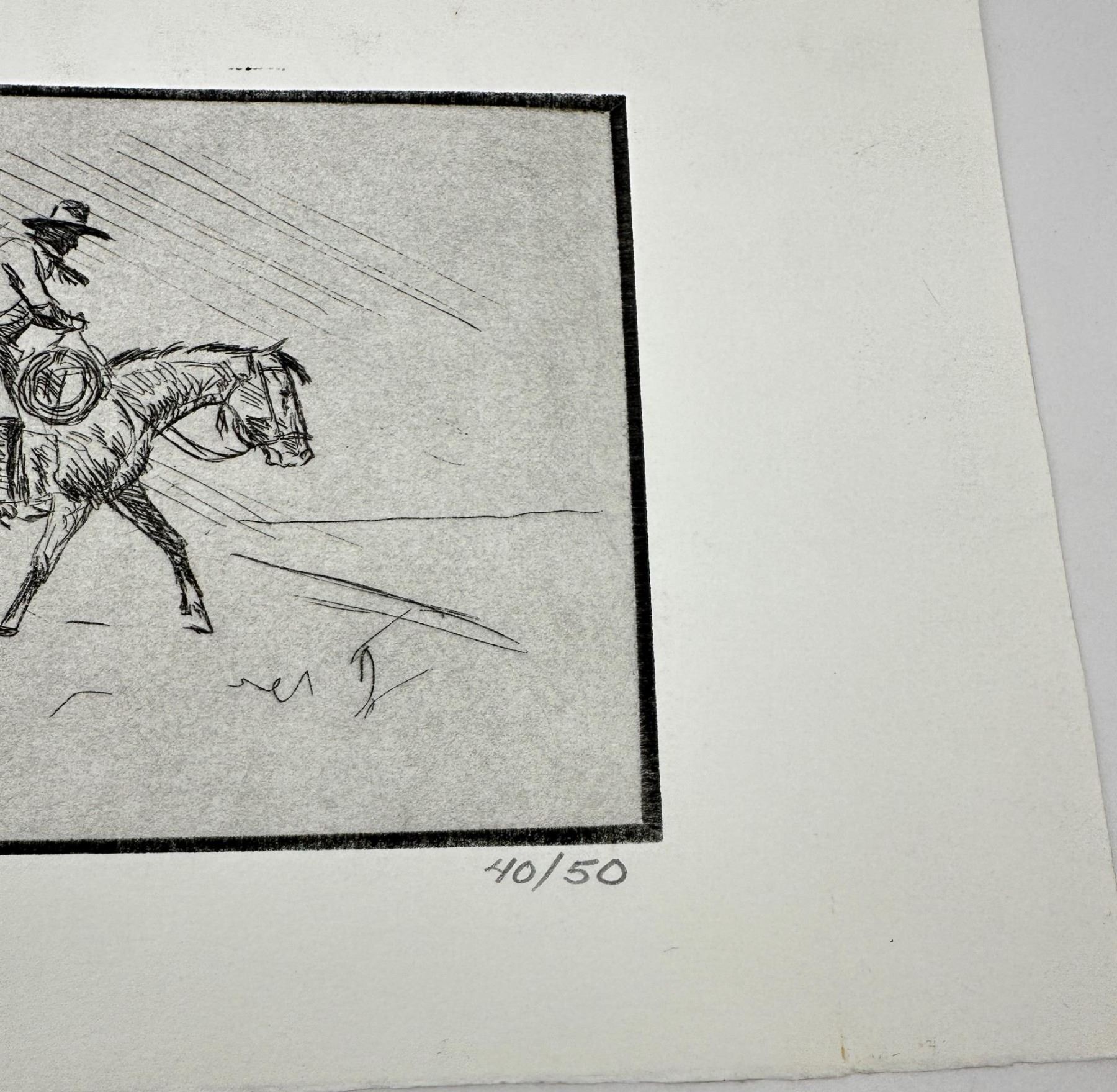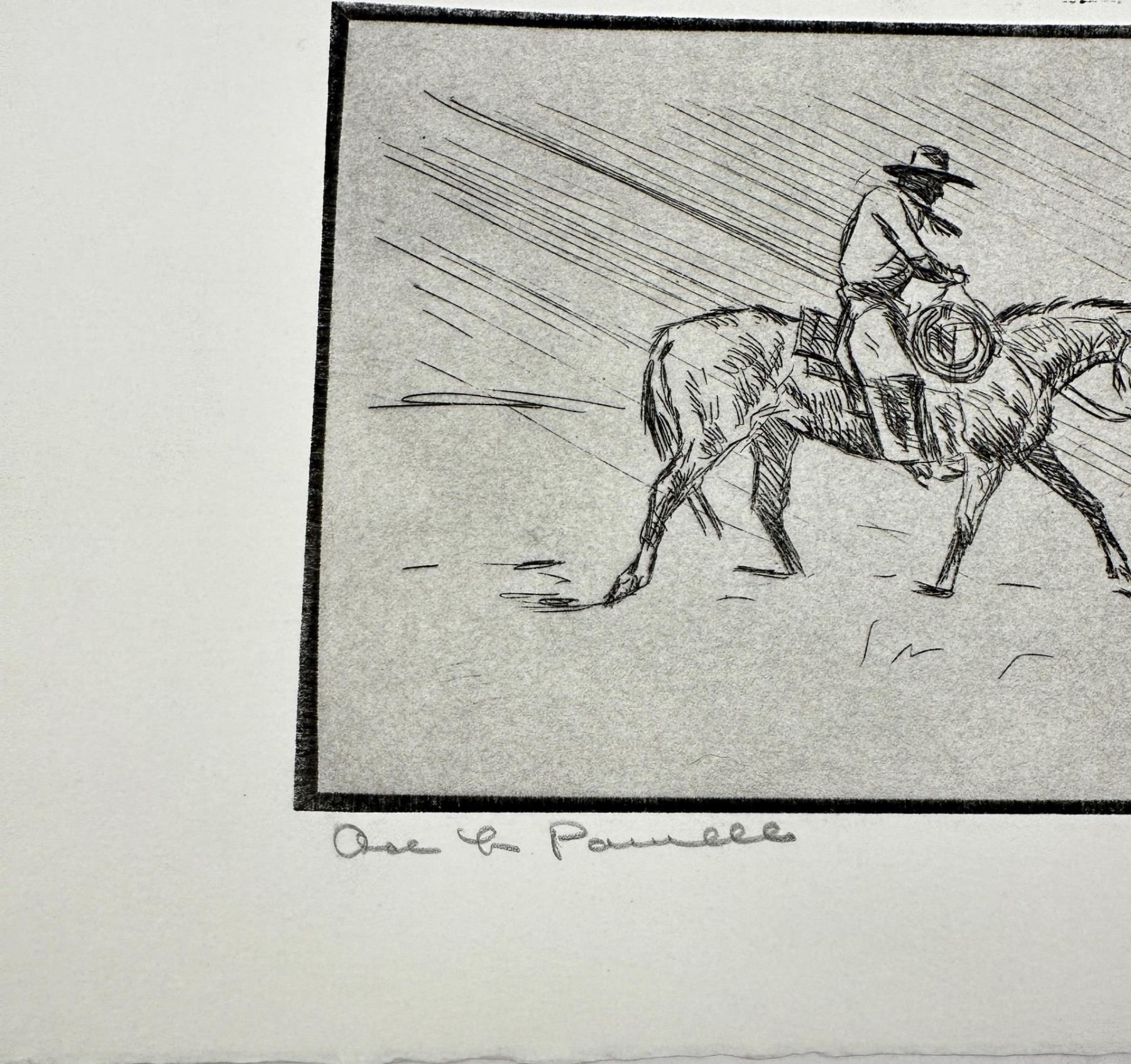7 1/8" by 11 7/8". Born in Tularosa, New Mexico, Ace Powell became a painter of western action scenes, wild animals, and Indian figures in realistic style and in the tradition of Charles Russell. Powell's trademark signature on his paintings is the ace of diamonds, which also became his nickname. He was prolific, creating between 12,000 and 15,000 paintings and sculptures. He considered oil to be his best medium although he loved sculpting in terra cotta, stone, and wood. He also was skilled at etching. His life has involved many changes of location and personal circumstance, much of it due to his alcoholism, which he eventually overcame. Eventually he settled in Kalispell. He moved to Montana at age one month. His mother was a schoolteacher, and his father was a cowboy foreman on the Ben Steven's horse ranch, then a homesteader, and eventually a worker for the Glacier National Park Service. Charlie Russell' s summer home was near the Powell home, and the Russells were family friends and encouraged Asa, nicknamed "Ace" in his artistic talent. He loved the Blackfeet Indians so much his father sent him to school on their reservation, and these people became one of his most frequent subjects. He also worked on the Bar X Six Ranch where he was a saddle-horse guide for many visiting successful western artists. He built a studio in Choteau, Montana and from there worked as a wood animal sculptor and also did book illustrations. After his first wife died when he was 29, he was briefly in the Army, worked in a defense plant, and was in the plastic figurine business in Yakima, Washington, but his partner ran off with his second wife, obviously terminating their business arrangement. He returned to Glacier Park for six years with his young son and then at age 40 enrolled in the University of Montana on the G.I. Bill. But he disliked the abstract art being promoted, so he quit and took the Famous Artists correspondence course, which really helped him down the path that established his art career. In 1952, he married artist Nancy McLaughlin, and in Hungry Horse, Montana they successfully operated a gallery, but it burned to the ground in 1964. They divorced, and in 1965, he married Thelma Conner.