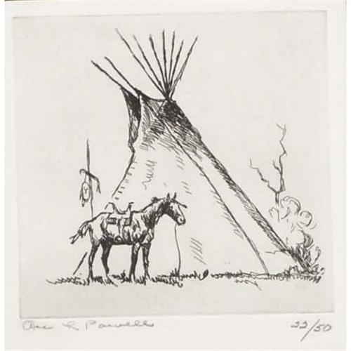 2296 Ace Powell , Etching Tee Pee 22/50 Pencil signed lower left 4 3/4" x 4 3/4"