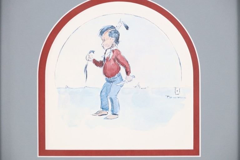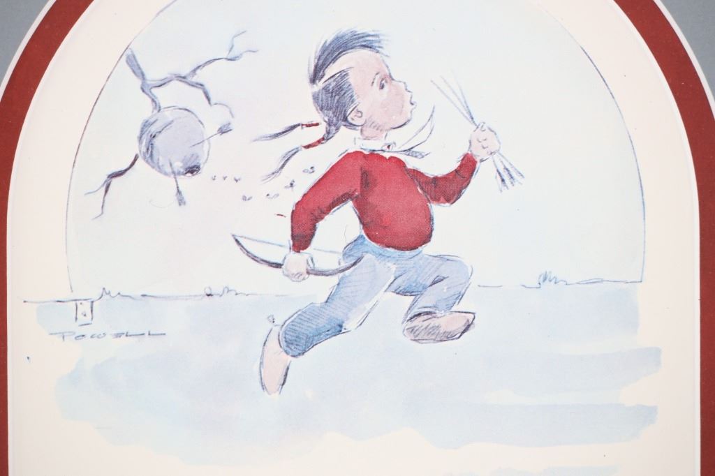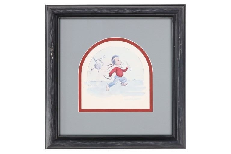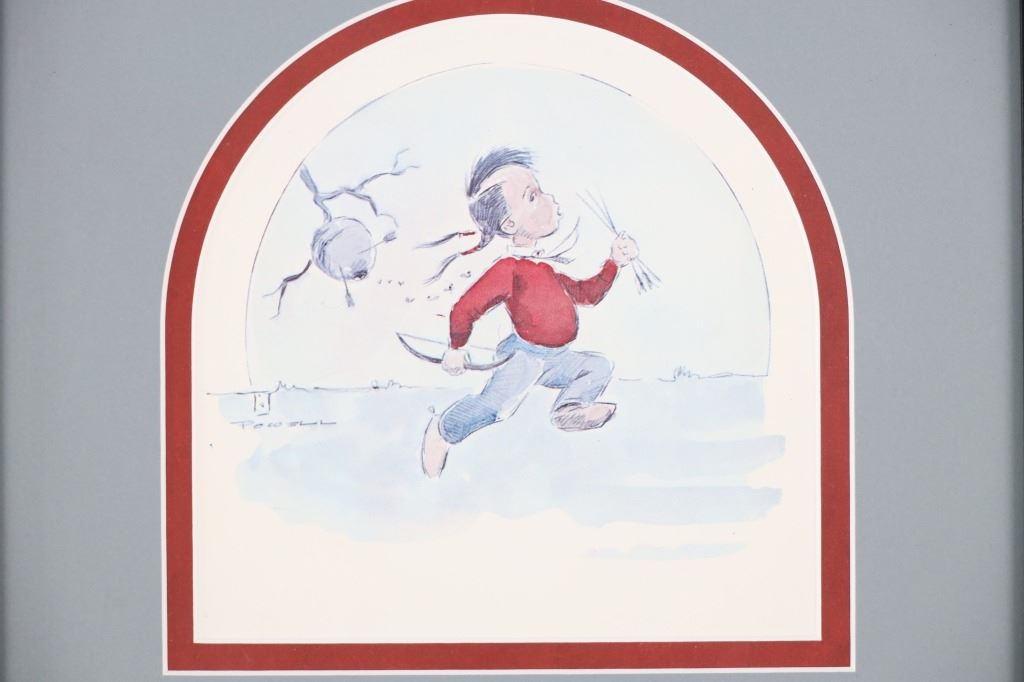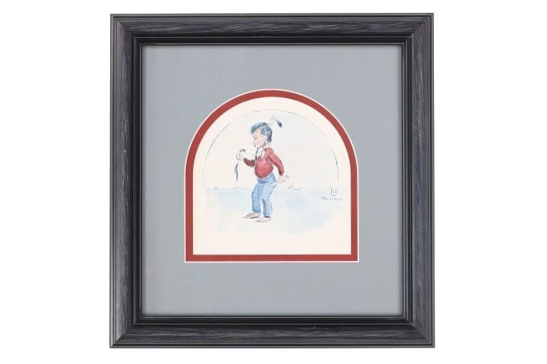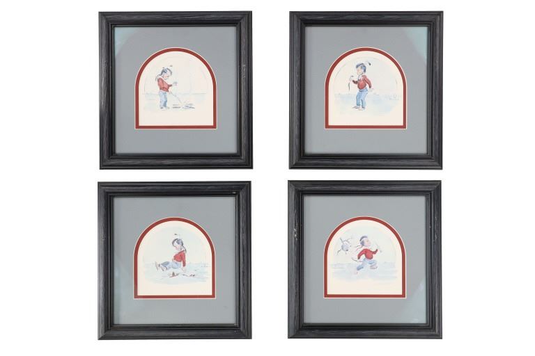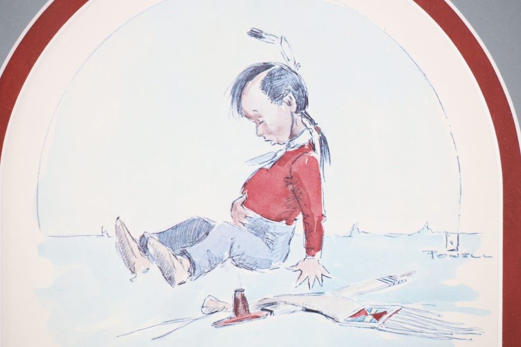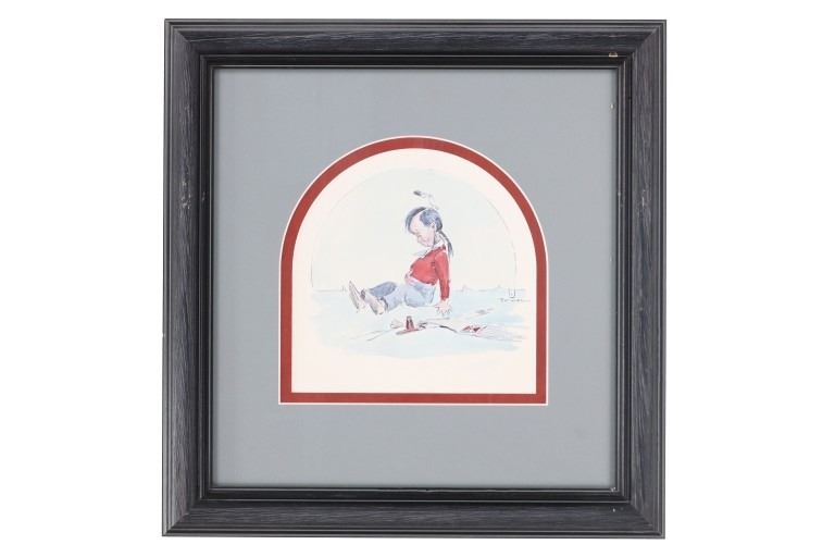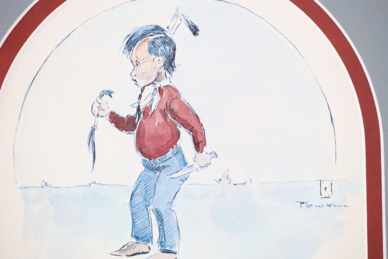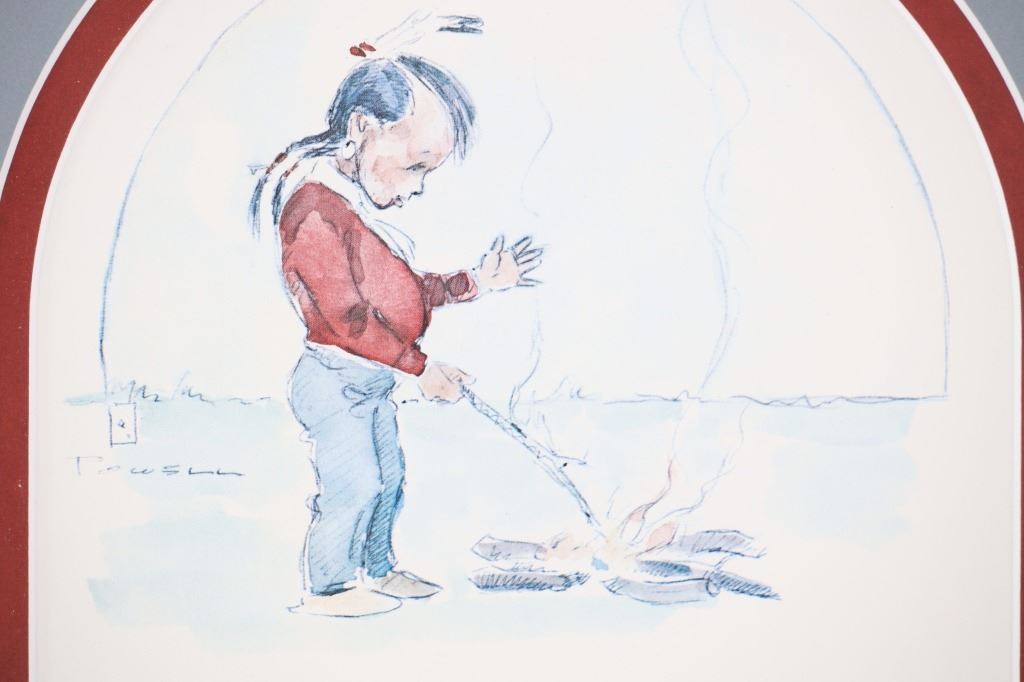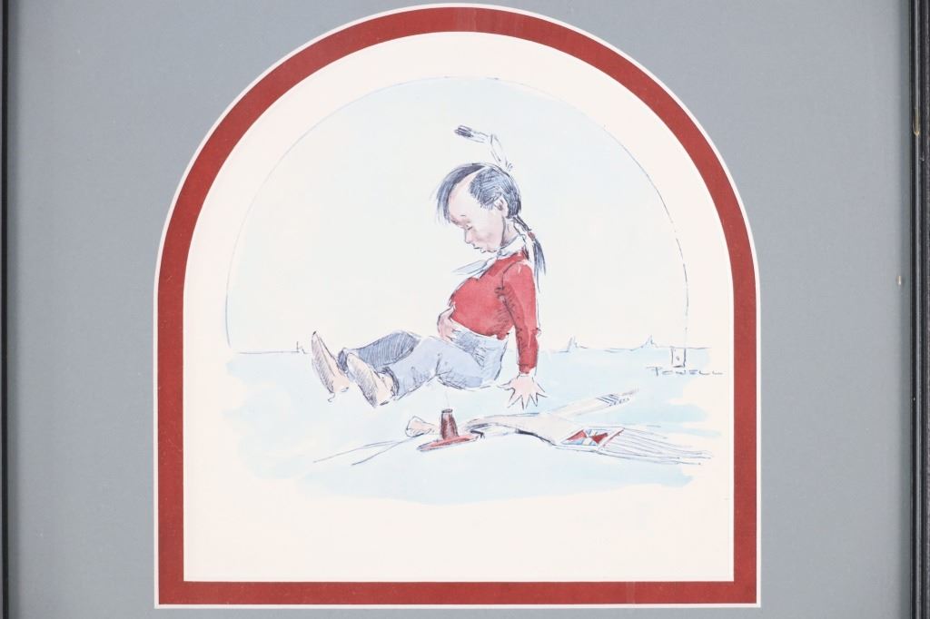 Offered in this lot is an Ace Powell Indian Boy Watercolour Print Collection, (4) framed, circa 1960s-1970s. Asa Lynn "Ace" Powell (1912-1978) was an American painter, sculptor, and etcher of genre scenes and imagery relating to indians, cowboys, horses, and wildlife. Powell went to boarding school for highschool in Browning, Montana on the Blackfoot Indian Reservation fulfilling a dream he had about living amongst Indians. His interest in horses, art and Indians continued. His artwork was influenced by that of fellow Montana artist and family friend, Charles "Charlie" M. Russell. As a young boy Ace would accompany the cowboy artist Russell on morning rides, watching him sketch and draw. Powell had contact with prominent artists such as Olaf Seltzer, Hans Reiss, and Winold Reiss. Powell depicted the rough riding of cowboys, the majestic lifestyle of Native Americans, and the distinctive wildlife roaming the plains through his realistic paintings, prints, watercolours and sculptures. The "Indian Boy" collection features four framed watercolour prints of a young, pot-bellied Native boy experiencing daily and sometimes humourous events such as being chased by angry bees after he shot arrows into their tree limb-hanging hive, sitting on the ground, overcome by the effects of the still smoldering trading post pipe. In another harmless normal scene the boy is stirring a campfire with a stick, while in the last humourous scene the boy's face displays the shock of reality of him holding the remnant of the freshly cutoff ponytail. Powell's hallmark "Ace of Diamonds" is visible above his signature. Each double matted print is in nice condition, professionally mounted in matching wood frames, slight scuffing to edges. Each measures 15.125"W x 15.625"L x.75"D, collective weight is 10lb, 10oz.