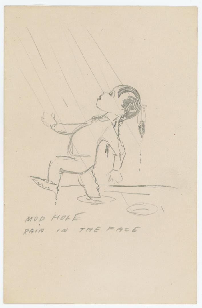 Title is Mud Hole Rain in the Face. " by ". Pencil on Paper. 8" by 5 1/4". Ace (Asa Lynn) Powell (1912 - 1978) was active/lived in Montana, New Mexico. Ace Powell is known for Cowboy genre and Indian figure painting. Born in Tularosa, New Mexico, Ace Powell became a painter of western action scenes, wild animals, and Indian figures in realistic style and in the tradition of Charles Russell. Powell's trademark signature on his paintings is the ace of diamonds, which also became his nickname. He was prolific, creating between 12,000 and 15,000 paintings and sculptures. He considered oil to be his best medium although he loved sculpting in terra cotta, stone, and wood. He also was skilled at etching. His life has involved many changes of location and personal circumstance, much of it due to his alcoholism, which he eventually overcame. Eventually he settled in Kalispell. He moved to Montana at age one month. His mother was a schoolteacher, and his father was a cowboy foreman on the Ben Steven's horse ranch, then a homesteader, and eventually a worker for the Glacier National Park Service. Charlie Russell' s summer home was near the Powell home, and the Russells were family friends and encouraged Asa, nicknamed "Ace" in his artistic talent. He loved the Blackfeet Indians so much his father sent him to school on their reservation, and these people became one of his most frequent subjects. He also worked on the Bar X Six Ranch where he was a saddle-horse guide for many visiting successful western artists. He built a studio in Choteau, Montana and from there worked as a wood animal sculptor and also did book illustrations. After his first wife died when he was 29, he was briefly in the Army, worked in a defense plant, and was in the plastic figurine business in Yakima, Washington, but his partner ran off with his second wife, obviously terminating their business arrangement. He returned to Glacier Park for six years with his young son and then at age 40 enrolled in the University of Montana on the G.I. Bill. But he disliked the abstract art being promoted, so he quit and took the Famous Artists correspondence course, which really helped him down the path that established his art career. In 1952, he married artist Nancy McLaughlin, and in Hungry Horse, Montana they successfully operated a gallery, but it burned to the ground in 1964. They divorced, and in 1965, he married Thelma Conner.
