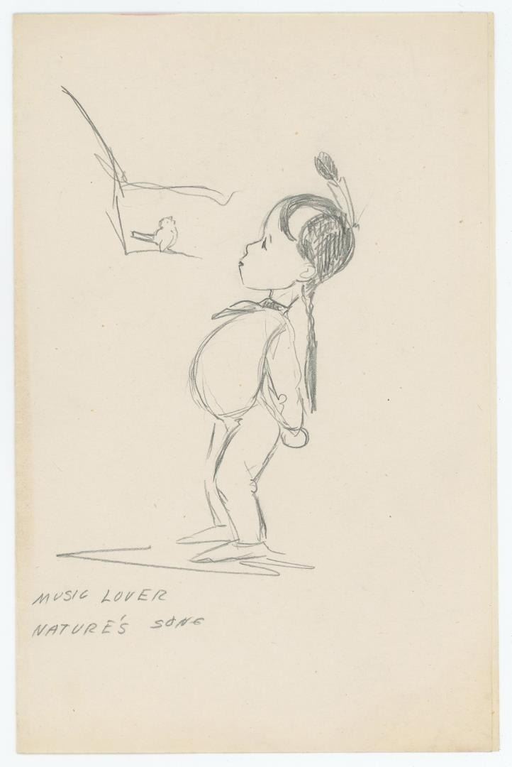 Title is Music Lover Nature's Song. " by ". Pencil on Paper. 8" by 5 1/4". Ace (Asa Lynn) Powell (1912 - 1978) was active/lived in Montana, New Mexico. Ace Powell is known for Cowboy genre and Indian figure painting. Born in Tularosa, New Mexico, Ace Powell became a painter of western action scenes, wild animals, and Indian figures in realistic style and in the tradition of Charles Russell. Powell's trademark signature on his paintings is the ace of diamonds, which also became his nickname. He was prolific, creating between 12,000 and 15,000 paintings and sculptures. He considered oil to be his best medium although he loved sculpting in terra cotta, stone, and wood. He also was skilled at etching. His life has involved many changes of location and personal circumstance, much of it due to his alcoholism, which he eventually overcame. Eventually he settled in Kalispell. He moved to Montana at age one month. His mother was a schoolteacher, and his father was a cowboy foreman on the Ben Steven's horse ranch, then a homesteader, and eventually a worker for the Glacier National Park Service. Charlie Russell' s summer home was near the Powell home, and the Russells were family friends and encouraged Asa, nicknamed "Ace" in his artistic talent. He loved the Blackfeet Indians so much his father sent him to school on their reservation, and these people became one of his most frequent subjects. He also worked on the Bar X Six Ranch where he was a saddle-horse guide for many visiting successful western artists. He built a studio in Choteau, Montana and from there worked as a wood animal sculptor and also did book illustrations. After his first wife died when he was 29, he was briefly in the Army, worked in a defense plant, and was in the plastic figurine business in Yakima, Washington, but his partner ran off with his second wife, obviously terminating their business arrangement. He returned to Glacier Park for six years with his young son and then at age 40 enrolled in the University of Montana on the G.I. Bill. But he disliked the abstract art being promoted, so he quit and took the Famous Artists correspondence course, which really helped him down the path that established his art career. In 1952, he married artist Nancy McLaughlin, and in Hungry Horse, Montana they successfully operated a gallery, but it burned to the ground in 1964. They divorced, and in 1965, he married Thelma Conner.