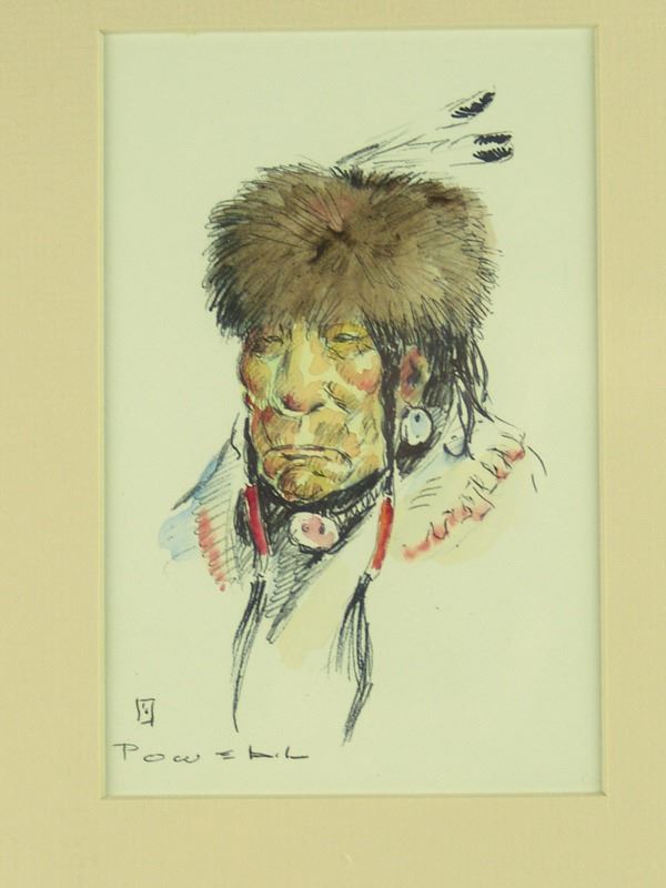 Small, signed original water color on paper, a portrait of a Blood man. Very good condition, matted and framed.Ca.1970s6" x 4" (13" x 11")
