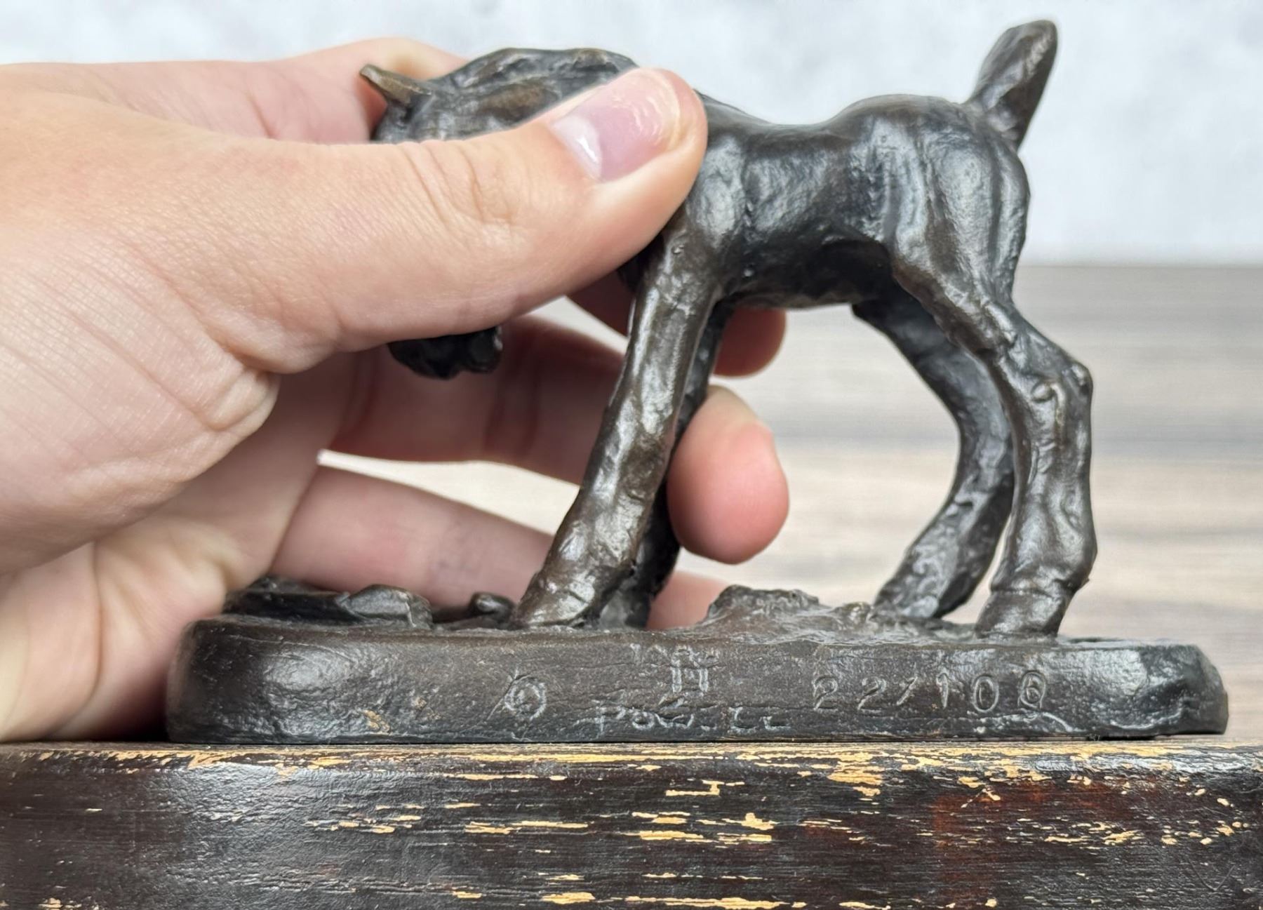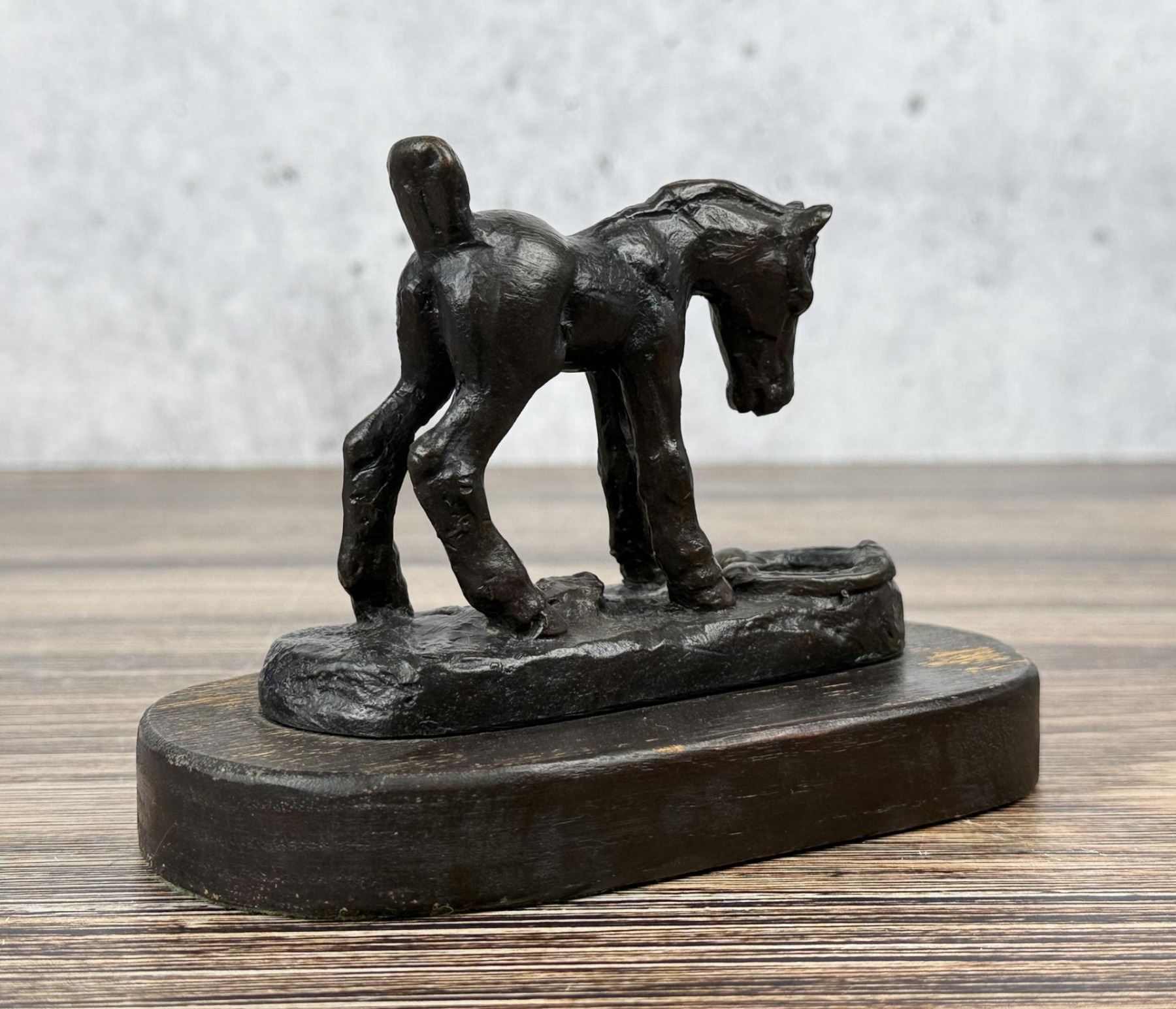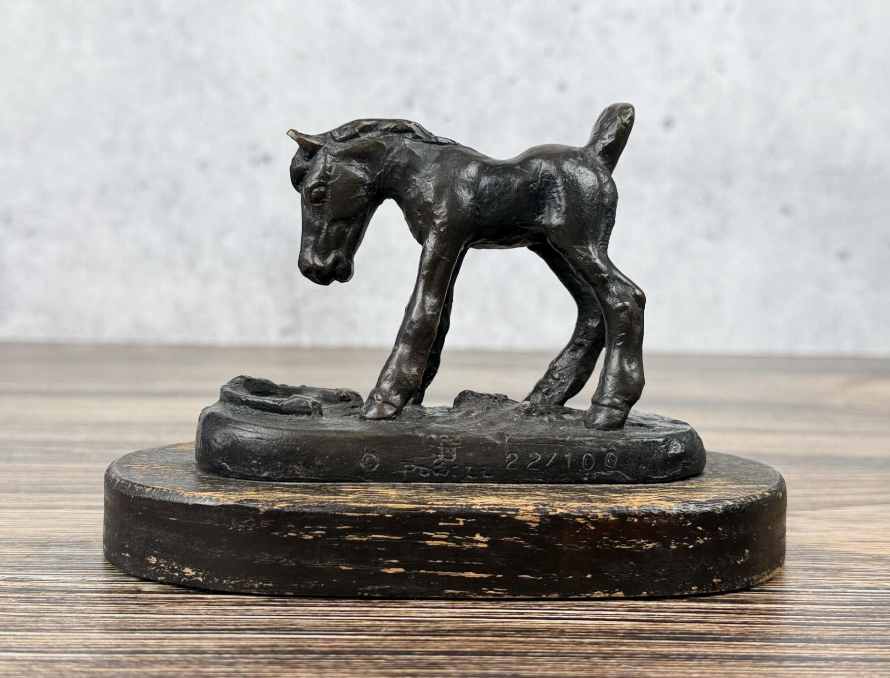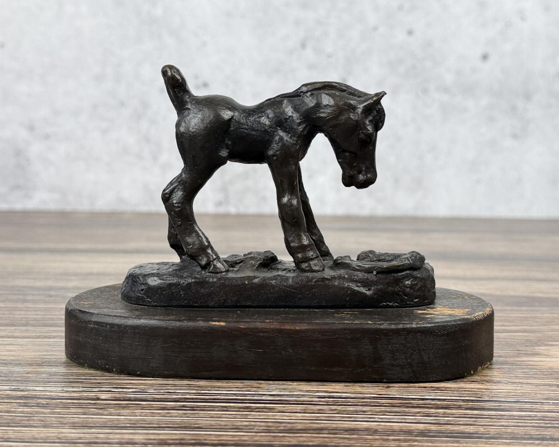 Title is Surprise. 6" by 4" by 3 3/8". 22/100. Ace (Asa Lynn) Powell (1912 - 1978) was active/lived in Montana, New Mexico. Ace Powell is known for Cowboy genre and Indian figure painting. Born in Tularosa, New Mexico, Ace Powell became a painter of western action scenes, wild animals, and Indian figures in realistic style and in the tradition of Charles Russell. Powell's trademark signature on his paintings is the ace of diamonds, which also became his nickname. He was prolific, creating between 12,000 and 15,000 paintings and sculptures. He considered oil to be his best medium although he loved sculpting in terra cotta, stone, and wood. He also was skilled at etching. His life has involved many changes of location and personal circumstance, much of it due to his alcoholism, which he eventually overcame. Eventually he settled in Kalispell. He moved to Montana at age one month. His mother was a schoolteacher, and his father was a cowboy foreman on the Ben Steven's horse ranch, then a homesteader, and eventually a worker for the Glacier National Park Service. Charlie Russell' s summer home was near the Powell home, and the Russells were family friends and encouraged Asa, nicknamed "Ace" in his artistic talent. He loved the Blackfeet Indians so much his father sent him to school on their reservation, and these people became one of his most frequent subjects. He also worked on the Bar X Six Ranch where he was a saddle-horse guide for many visiting successful western artists. He built a studio in Choteau, Montana and from there worked as a wood animal sculptor and also did book illustrations. After his first wife died when he was 29, he was briefly in the Army, worked in a defense plant, and was in the plastic figurine business in Yakima, Washington, but his partner ran off with his second wife, obviously terminating their business arrangement. He returned to Glacier Park for six years with his young son and then at age 40 enrolled in the University of Montana on the G.I. Bill. But he disliked the abstract art being promoted, so he quit and took the Famous Artists correspondence course, which really helped him down the path that established his art career. In 1952, he married artist Nancy McLaughlin, and in Hungry Horse, Montana they successfully operated a gallery, but it burned to the ground in 1964. They divorced, and in 1965, he married Thelma Conner.