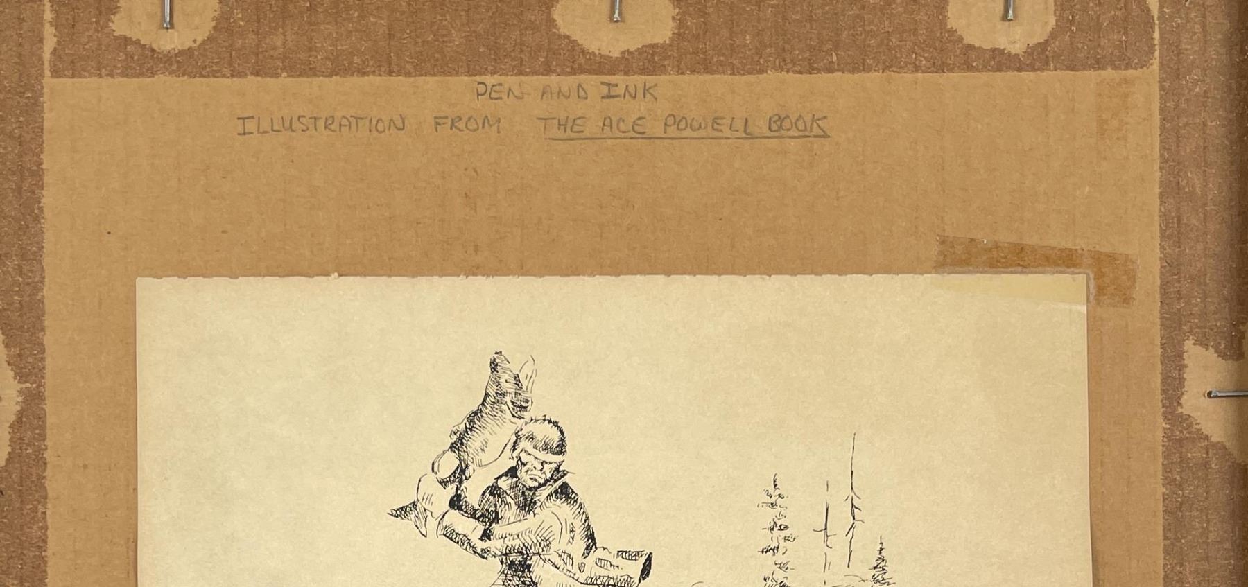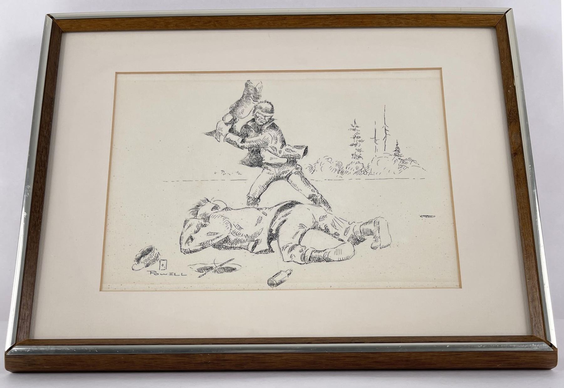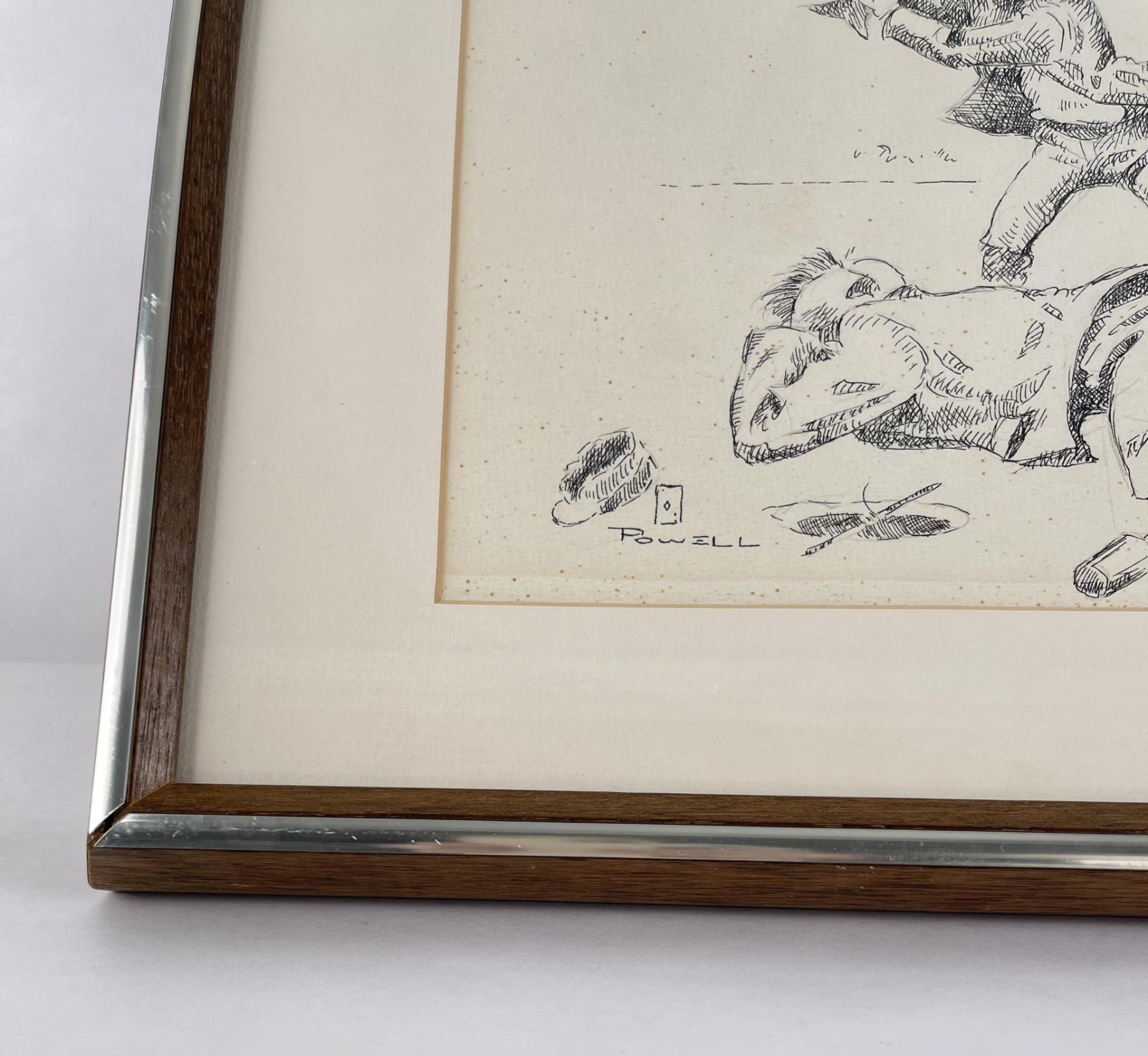 13" by 17" framed. Title is No Disarmament. This is the original drawing, it was illustrated in The Ace Powell Book page 169. Born in Tularosa, New Mexico, Ace Powell became a painter of western action scenes, wild animals, and Indian figures in realistic style and in the tradition of Charles Russell. Powell's trademark signature on his paintings is the ace of diamonds, which also became his nickname. He was prolific, creating between 12,000 and 15,000 paintings and sculptures. He considered oil to be his best medium although he loved sculpting in terra cotta, stone, and wood. He also was skilled at etching. His life has involved many changes of location and personal circumstance, much of it due to his alcoholism, which he eventually overcame. Eventually he settled in Kalispell. He moved to Montana at age one month. His mother was a schoolteacher, and his father was a cowboy foreman on the Ben Steven's horse ranch, then a homesteader, and eventually a worker for the Glacier National Park Service. Charlie Russell' s summer home was near the Powell home, and the Russells were family friends and encouraged Asa, nicknamed "Ace" in his artistic talent. He loved the Blackfeet Indians so much his father sent him to school on their reservation, and these people became one of his most frequent subjects. He also worked on the Bar X Six Ranch where he was a saddle-horse guide for many visiting successful western artists. He built a studio in Choteau, Montana and from there worked as a wood animal sculptor and also did book illustrations. After his first wife died when he was 29, he was briefly in the Army, worked in a defense plant, and was in the plastic figurine business in Yakima, Washington, but his partner ran off with his second wife, obviously terminating their business arrangement. He returned to Glacier Park for six years with his young son and then at age 40 enrolled in the University of Montana on the G.I. Bill. But he disliked the abstract art being promoted, so he quit and took the Famous Artists correspondence course, which really helped him down the path that established his art career. In 1952, he married artist Nancy McLaughlin, and in Hungry Horse, Montana they successfully operated a gallery, but it burned to the ground in 1964. They divorced, and in 1965, he married Thelma Conner.