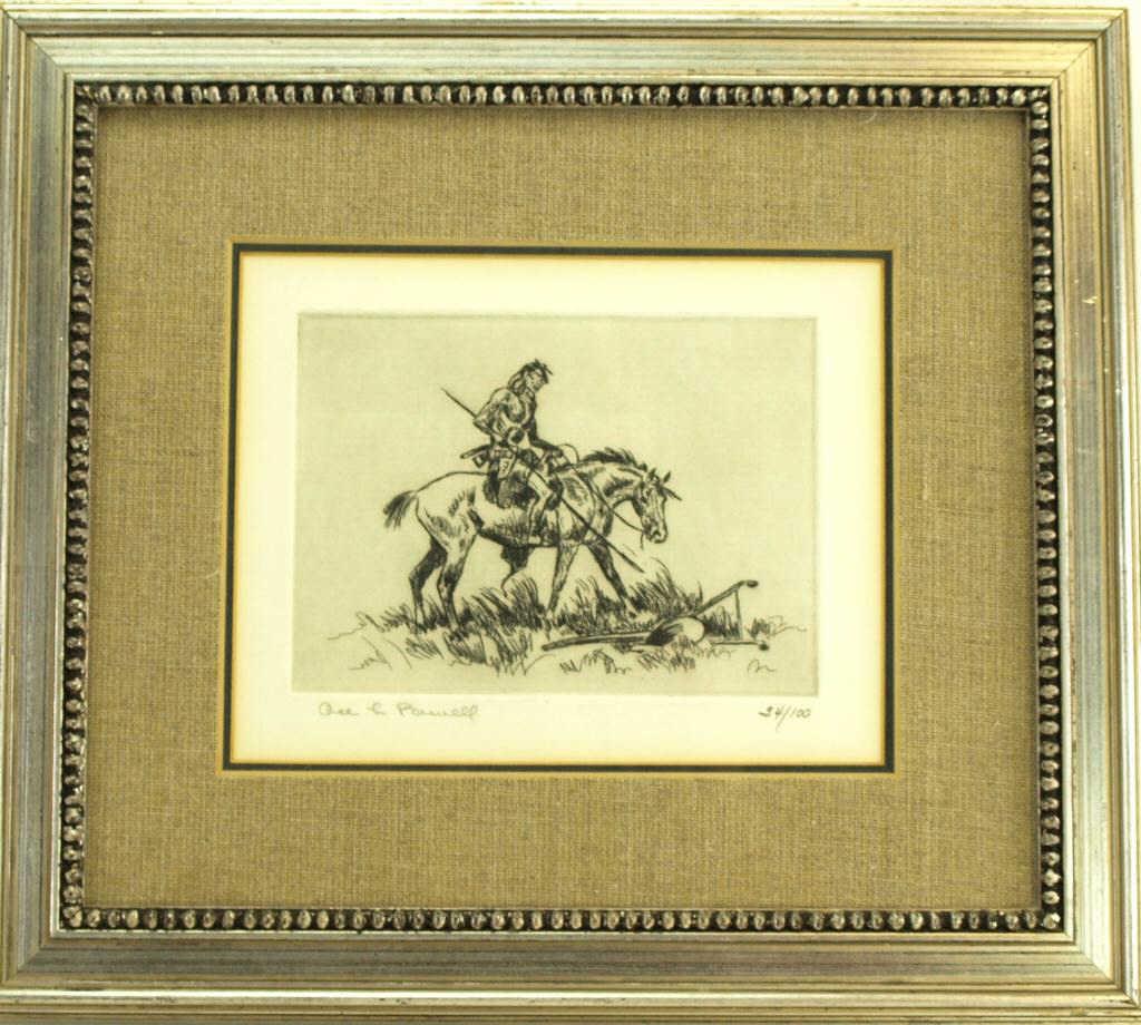 depicting an Indian Warrior on Horseback #34/100, image size 5" X 6 3/4'.