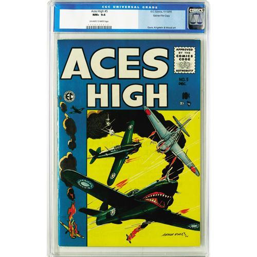 <B>Aces High #5 Gaines File pedigree 9/12 (EC, 1955) CGC NM+ 9.6 Off-white to white pages.</B></I> EC's experiments with Comics Code-approved fare didn't last long, but this short-lived title had superb stories and art, and great covers by George Evans such as this one. This was the last issue of the title. Jack Davis, Wally Wood, and Bernie Krigstein also contributed. Overstreet 2006 NM- 9.2 value = $170. CGC census 3/06: 2 in 9.6, none higher.