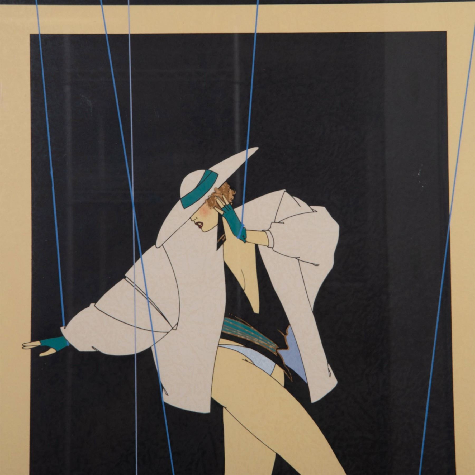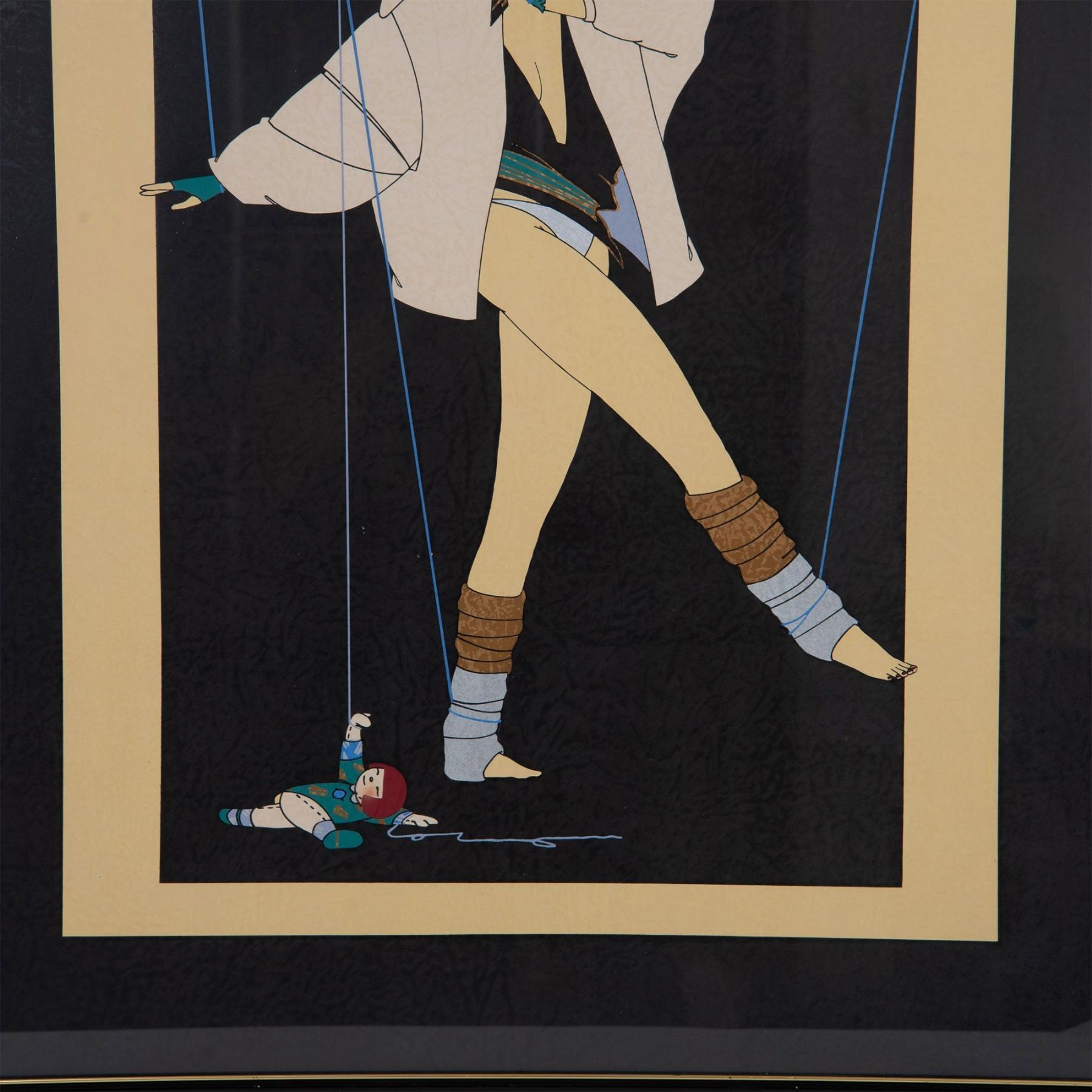 Sisters is a large Art Deco color style silkscreen on paper by Argentinian artist Acevedo Rafael. He represents a sexy woman and puppet doll, both with strings attached to their arms. Housed in a black with gild accent frame and a marbleized black background. Sight size: 29.50"L x 39.75"H. Frame dimensions: 32.25"L x 42.25"H x 1"W. Artwork can be unframed and rolled for shipment.